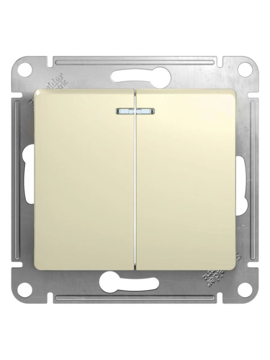 Механизм Systeme Electric серии Glossa (цвет бежевый) выключателя 2-клавишного c подсветкой подходит для сетей 250 В, на ток 10 А. - Благодаря современной светодиодной подсветке зеленого цвета изделие легко найти в темноте. - Двухклавишный выключатель позволяет управлять двумя источниками света с одной точки. - Выполнен из материала PС+ASA, стойкого к УФ-излучению и появлению царапин. - Эргономичные клеммы расположены в два ряда: сверху и снизу (ранее Schneider Electric NU521144N).