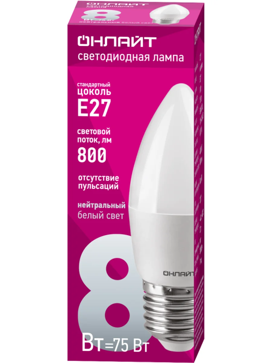 Лампа светодиодная 71 635 OLL-C37-8-230-4K-E27-FR ОНЛАЙТ 4670004716359 – лампа с колбой вида "свеча", нейтрального белого света, длиной 106 мм, с цоколем Е27, мощностью 8 Вт. Цветовая температура 4000 К.