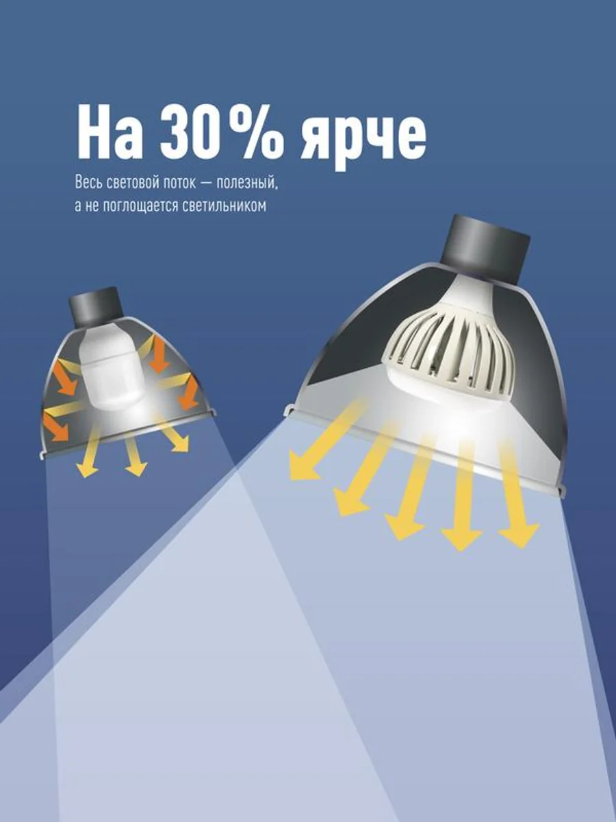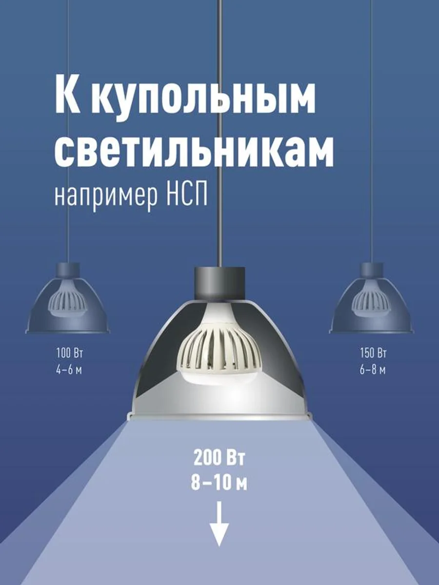 Светодиодная лампа 200 Вт под промышленный цоколь Е40 для светильников 220В. Для высоты подвеса светильника 8-10 м. По яркости заменяет лампы КЛЛ 250 Вт и ДРЛ 400 Вт. Используется в купольных светильниках - направленный вниз свет не поглощается стенками светильника и делает весь световой поток лампы полезным, что увеличивает яркость на 30%. Работает в диапазоне от 174В до 265В - не перегорит и не потеряет яркость при скачках напряжения в сети. Качественный свет, как у бытовых ламп, без эффекта стробоскопа (для работы с оборудованием с движущимися деталями). Увеличенный срок службы 50 000 часов. Цвет свечения лампы - 6500 К дневной