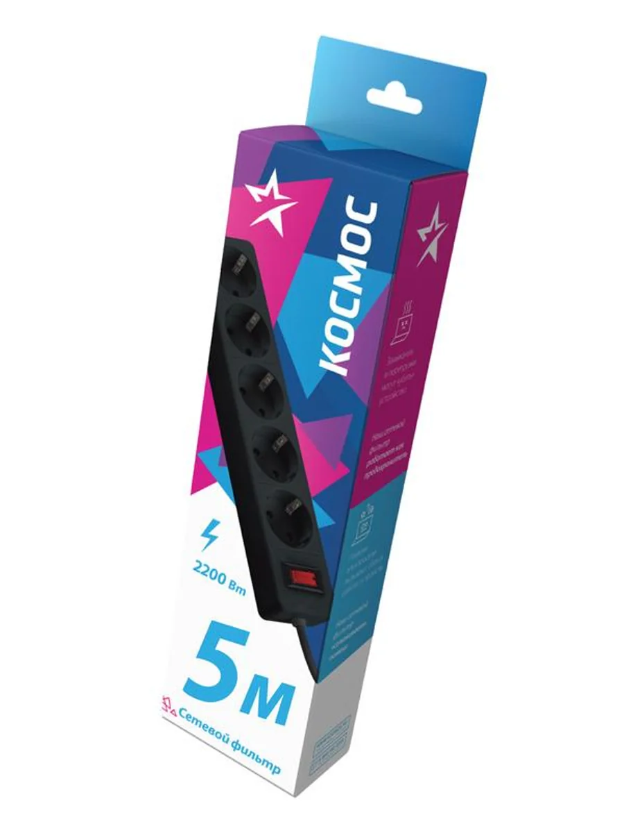 Черный сетевой фильтр 5м на 5 гнезд с двумя защитами для гаджетов и дорогой техники – варистор для защиты от «плохого» тока и терморазмыкатель для защиты от перегрузки и замыкания в сети. Сзади специальное крепление – можно повесить на стену. Корпус из негорючего полипропилена, 100% медный кабель ПВС 3х0,75мм (с заземлением). Контактная группа из латуни не деформируется со временем. Максимальная мощность подключения 2200Вт – хватит для нескольких устройств одновременно. 5 лет гарантии
