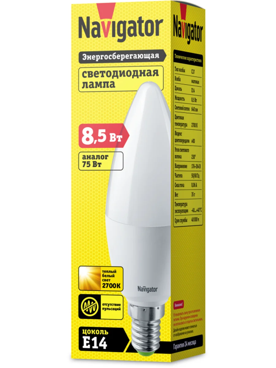 Лампа светодиодная 61 324 NLL-C37-8.5-230-2.7K-E14-FR 8.5Вт свеча матовая 2700К тепл. бел. E14 640лм 176-264В Navigator 61324 - купить в KeepBuilding | KeepBuilding