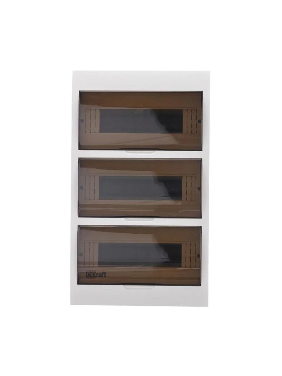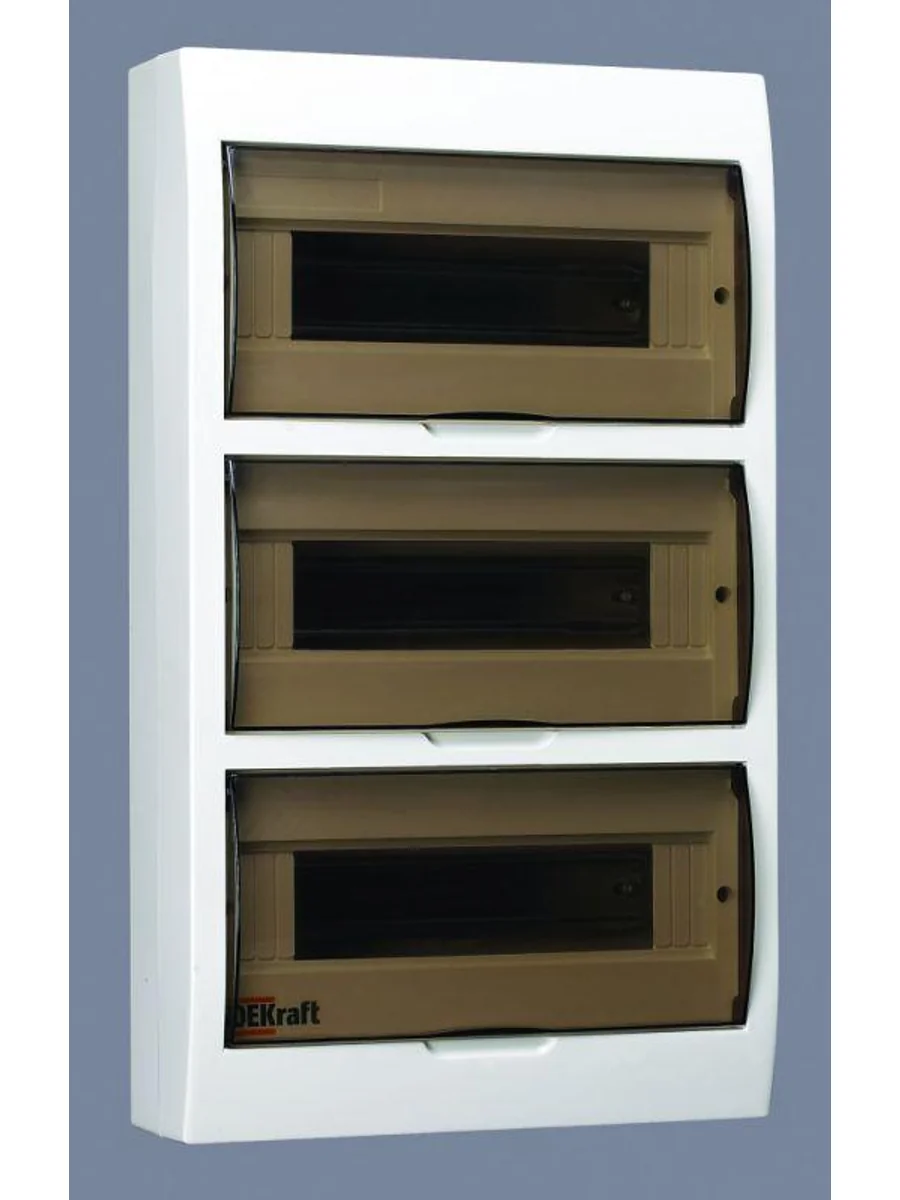 Корпус пластиковый навесной для электрических аппаратов серии ЩРН-П IP41 используют для установки в них модульной защитной аппаратуры. Дизайн корпуса имеет элегантные и скругленные формы, как и дверца, ее цвет темное органическое стекло. Фронтальные части корпуса, дверца, основание корпуса изготавливаются из самозатухающего ABS-пластика. Корпус имеет штампованные вводы для кабелей с разных сторон, и расстояния до точек крепления указаны сзади. Корпус является встраиваемым, имеет 3 черных DIN-рейки и 36 модулей (18 мм) для установки устройств, изолированные держатели для шинок, шинки N и PE. Дверцы на каждый ряд фиксируются в верхнем положении. Щиток на 100% совместим с модульным оборудованием Dekraft и Systeme Electric.