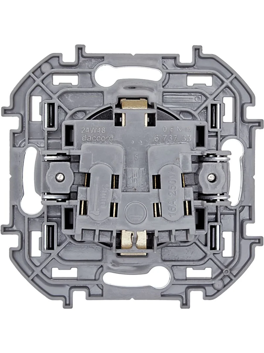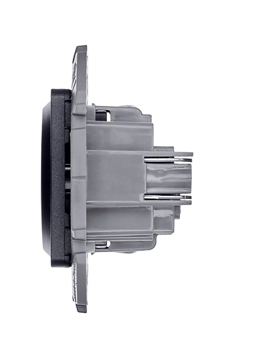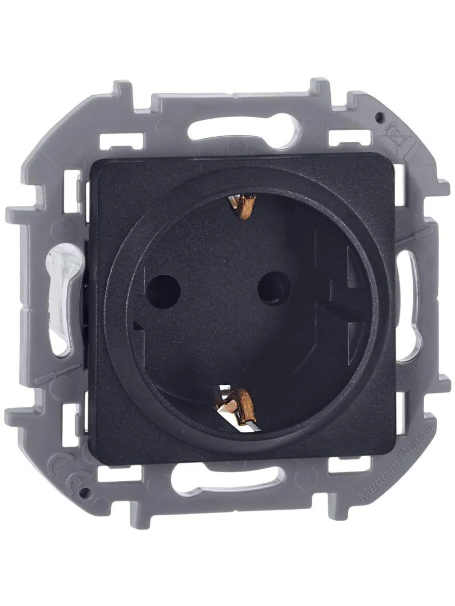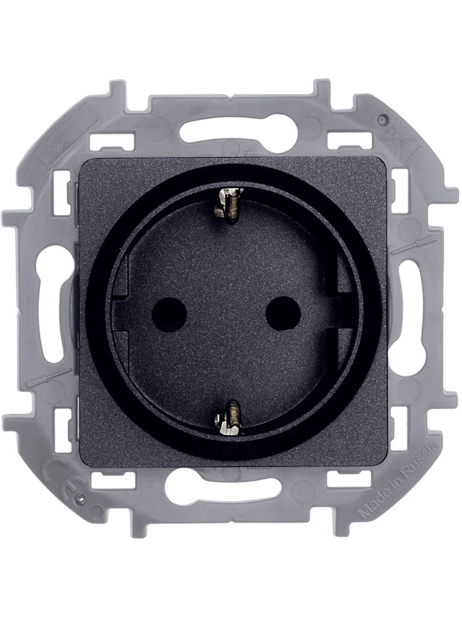Розетка с заземлением, с защитными шторками для скрытого монтажа Inspiria, цвет "Антрацит", максимальный ток 16А, напряжение ~250В, максимальная мощность 3680Вт, винтовые зажимы. Применяется для присоединения однофазных электрических потребителей к сети переменного тока в зданиях с проводкой с заземлением (с защитным проводником).