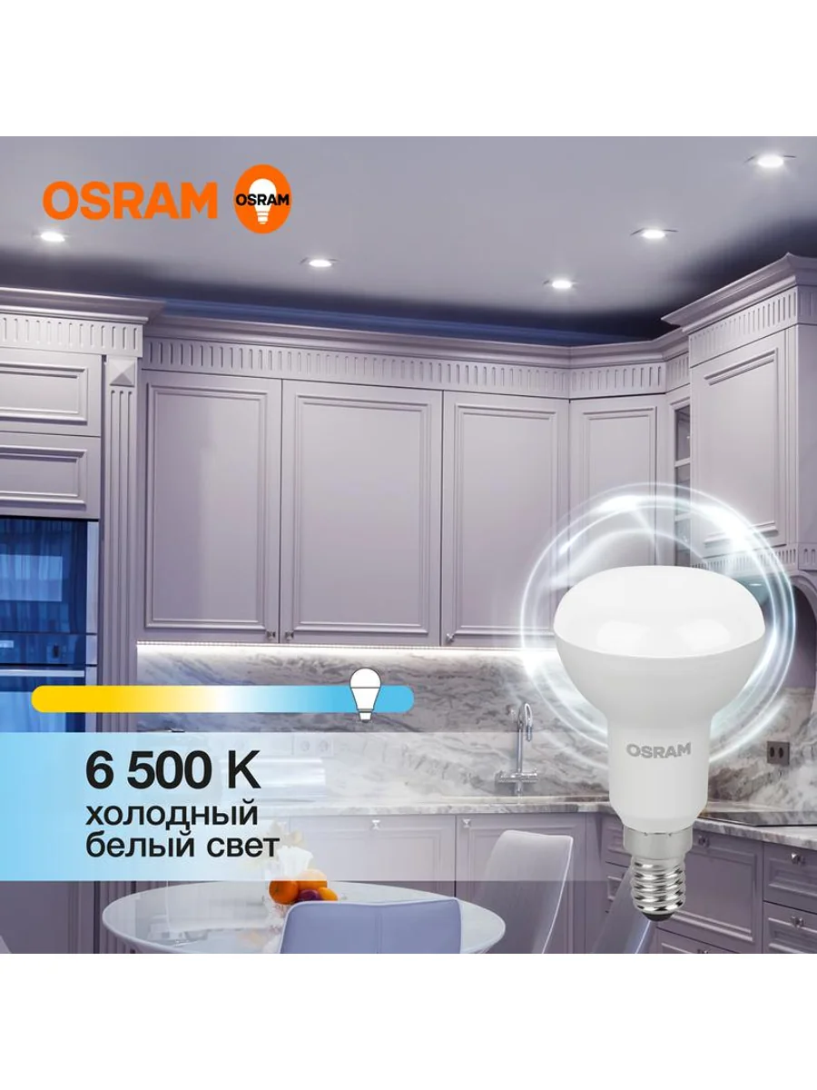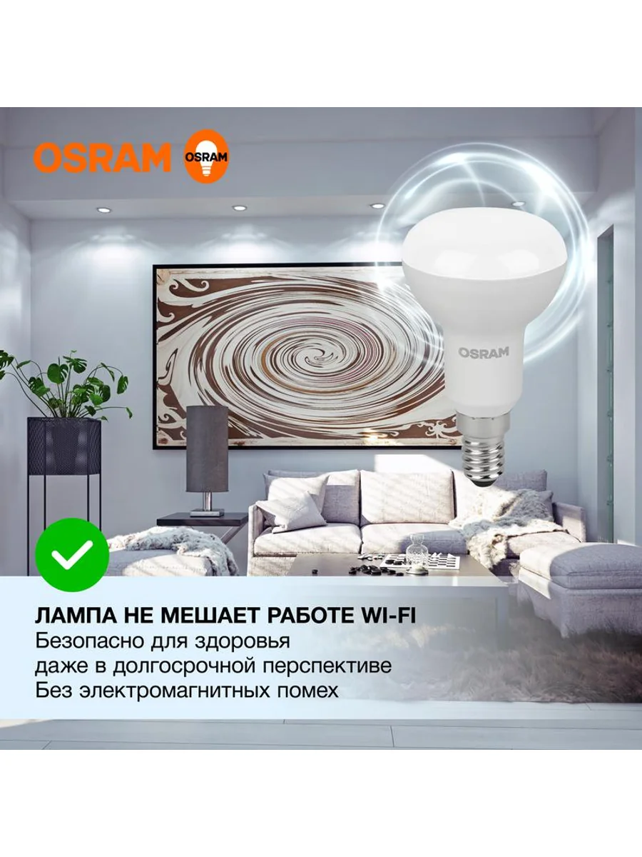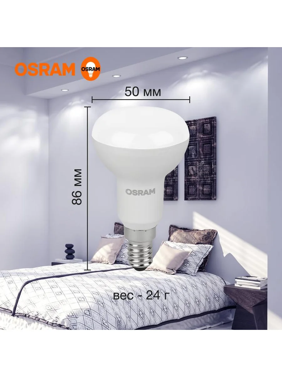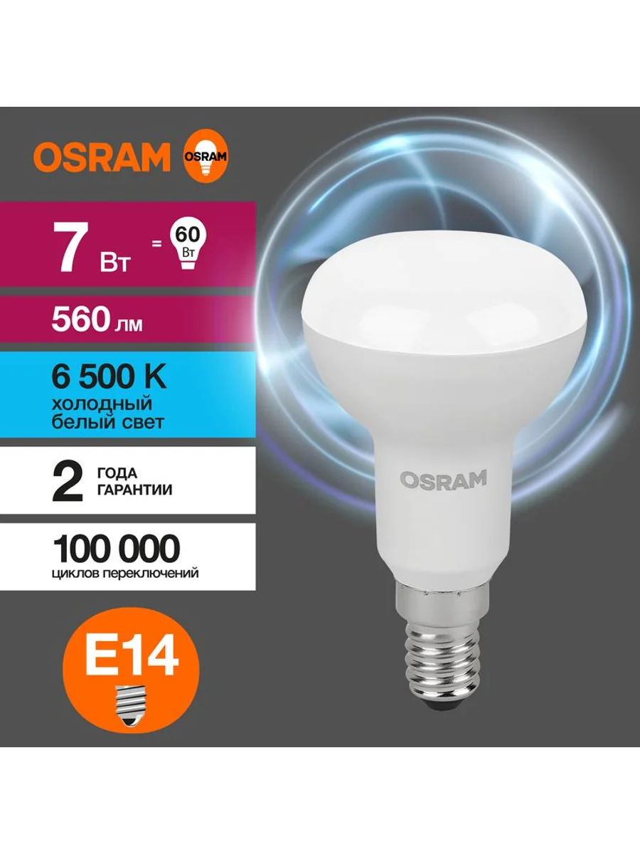 Светодиодные лампы OSRAM - разумная замена традиционным лампам накаливания или галогенным лампам. Светодиодные лампы OSRAM снижают затраты на освещение до 90% при сохранении привычного уровня освещенности. Эта лампа OSRAM серии LED Value выполнена в форме колбы R с цоколем E14. Материал колбы - пластик, исполнение - матовое. Световой поток 560 люмен, что соответствует лампе накаливания на 60 Вт. Это лампа направленного света, что зашифровано в ее названии (R - reflector, рефлектор). Такие лампы давно и успешно применяются для внутреннего освещения с помощью специальных светильников. Эта лампа излучает холодный белый свет, угол пучка - узкий. Качество света на высоте: низкие пульсации защищают глаза, а высокий индекс цветопередачи позволяет видеть мир в его истинном цвете. Кроме того, лампы OSRAM полностью безопасны для здоровья, поскольку в них нет опасных материалов по европейскому стандарту RoHS, а также они не производят вредных электромагнитных излучений, что подтверждено ЭМС (сертификат электромагнитной совместимости). Лампа проработает долго: срок службы - 25000 часов, 2 года гарантии. Светодиодные лампы OSRAM - умный выбор для здоровья семьи и кошелька!