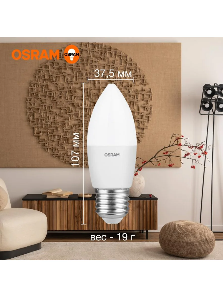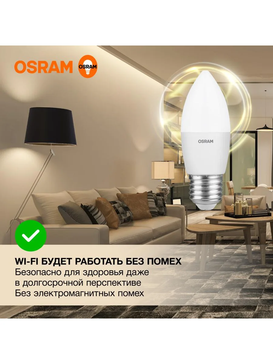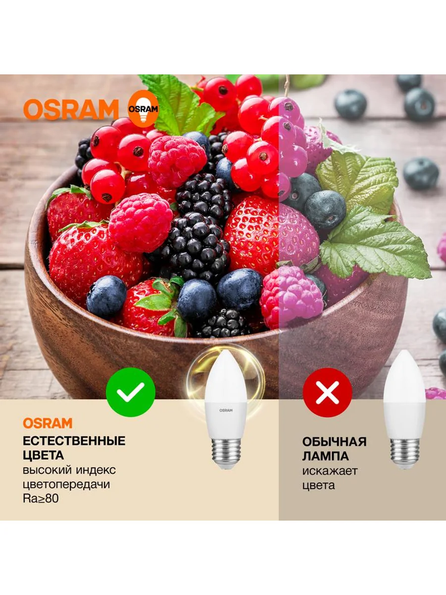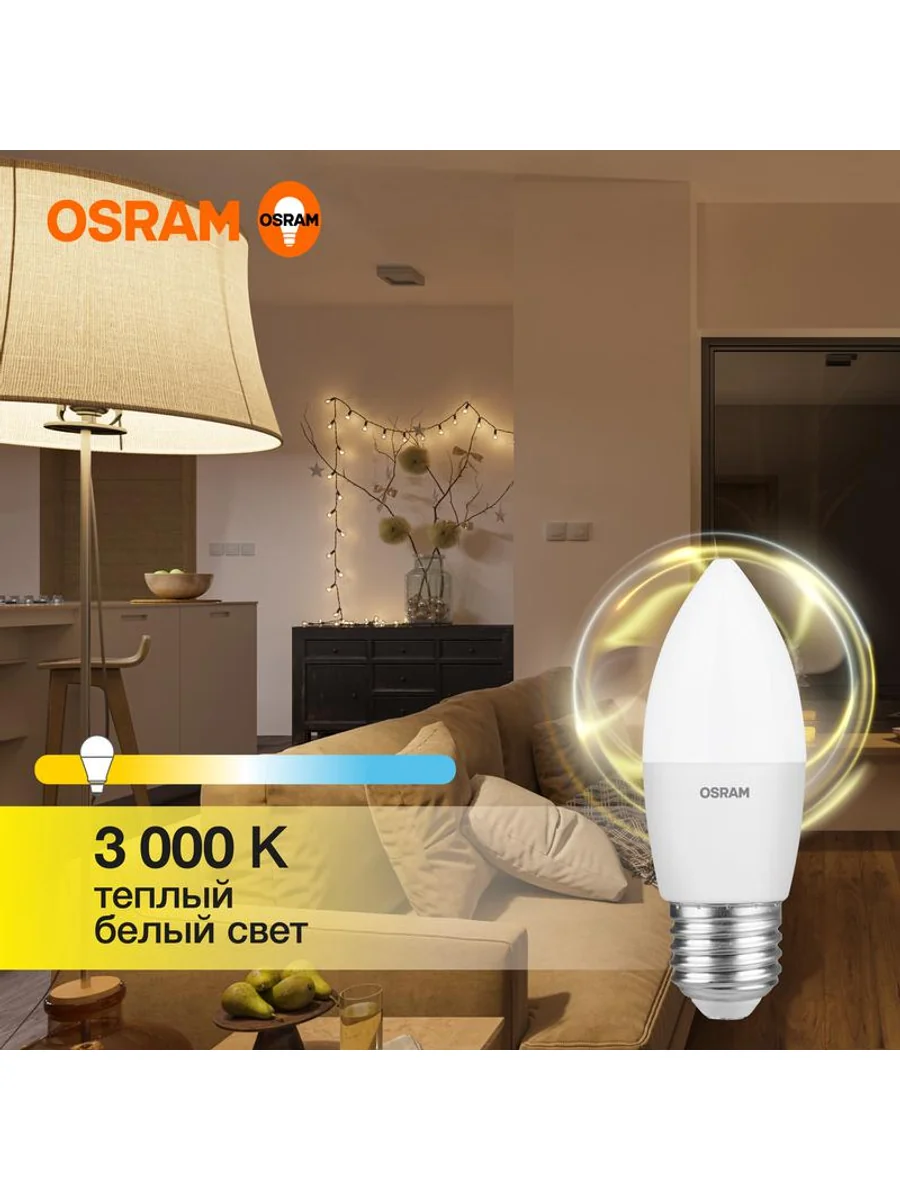 Светодиодные лампы OSRAM - разумная замена традиционным лампам накаливания или галогенным лампам. Светодиодные лампы OSRAM снижают затраты на освещение до 90% при сохранении привычного уровня освещенности. Эта лампа OSRAM серии LED Value выполнена в форме колбы B ("свеча") с цоколем E27. Материал колбы - пластик, исполнение - матовое. Световой поток 560 люмен, что соответствует лампе накаливания на 60 Вт. Такие лампы применяются для внутреннего освещения, хотя в закрытом светильнике можно использовать и на улице. Эта лампа излучает теплый белый свет, угол пучка - широкий. Качество света на высоте: низкие пульсации защищают глаза, а высокий индекс цветопередачи позволяет видеть мир в его истинном цвете. Кроме того, лампы OSRAM полностью безопасны для здоровья, поскольку в них нет опасных материалов по европейскому стандарту RoHS, а также они не производят вредных электромагнитных излучений, что подтверждено ЭМС (сертификат электромагнитной совместимости). Лампа проработает долго: срок службы - 25000 часов, 2 года гарантии. Светодиодные лампы OSRAM - умный выбор для здоровья семьи и кошелька!