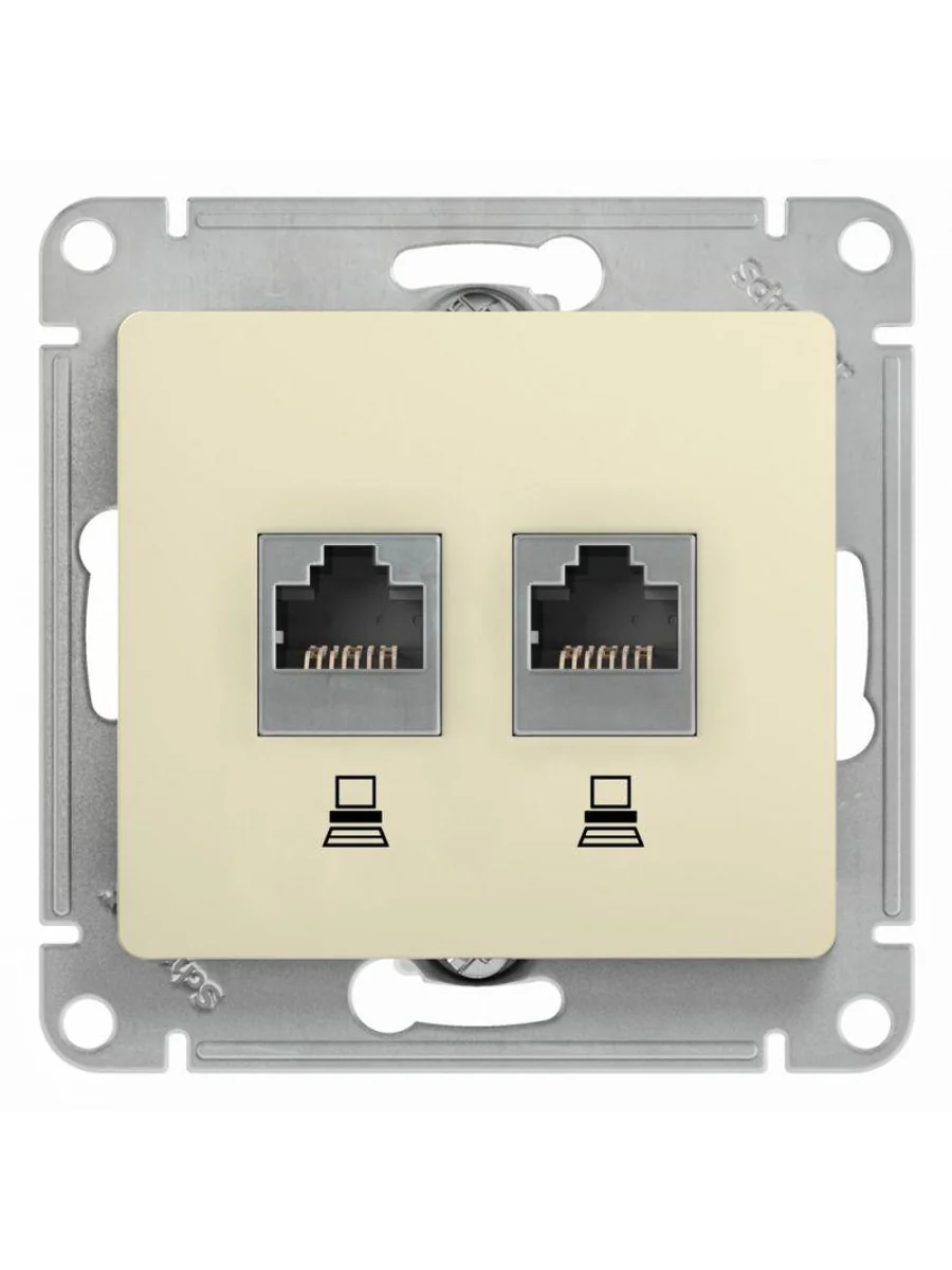 Механизм Systeme Electric серии Glossa (цвет бежевый) двойной розетки компьютерной с разъёмом RJ45 категория 5е предназначен для удобного и быстрого подключения вашего компьютера к компьютерной сети. - Выполнен из материала PС+ASA, стойкого к УФ-излучению и появлению царапин (ранее Schneider Electric MGU5.2020.25ZD).