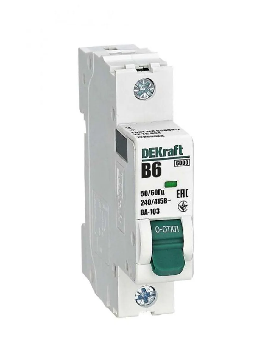 Автоматический выключатель серии ВА-103 NEW Dekraft; 1P; номинальный ток 6 А; характеристика B; отключающая способность 6 кА, что позволяет использовать аппараты в качестве вводных. 5 монолитных заклепок повышают прочность корпуса аппарата. Окошко-индикатор всегда показывает состояние контактов вне зависимости от положения рукоятки управления. Боковые каналы охлаждения повышают стабильность работы при высоких температурах окружающей среды. Есть возможность установки дополнительных аксессуаров с левой стороны устройства. Аппарат на 100% совместим с корпусами и оболочками Dekraft, Systeme Electric.