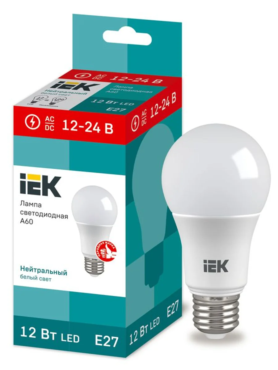 Лампа LED A60 груша 12Вт 12-24В 4000К E27 IEK применяется в сетях 12-24В постоянного и переменного тока, в помещениях с повышенной влажностью, а также низковольтных системах резервного освещения. Соответствует требованиям Технических регламентов Таможенного союза ТР ТС 020/2011, ТР ТС 037/2016, МЭК 62560, Постановления Правительства РФ от 10.11.2017 № 1356.