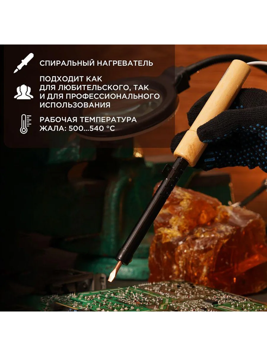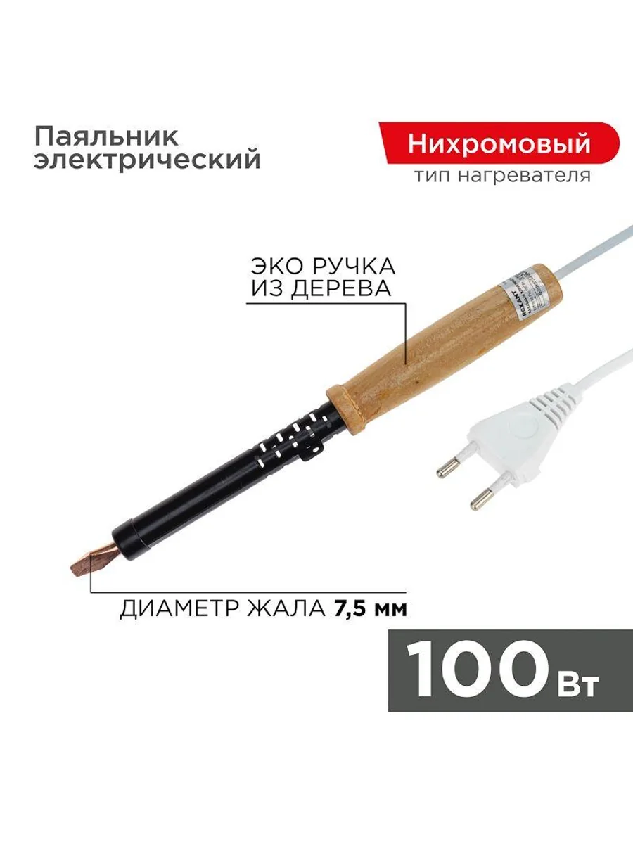 Паяльник с деревянной ручкой серии ЭПСН мощностью 100 Вт REXANT предназначен для ручного монтажа/демонтажа деталей среднего и крупного размера, а также для лужения. Подходит как для любительского, так и для профессионального использования. Медное жало выполнено в форме клина (лопатки), в случае необходимости его можно легко и быстро заменить (сменное жало в комплект не входит). Удобная эргономичная рукоятка выполнена из экологически чистого материала - дерева, она сделает работу с инструментом легкой и приятной.