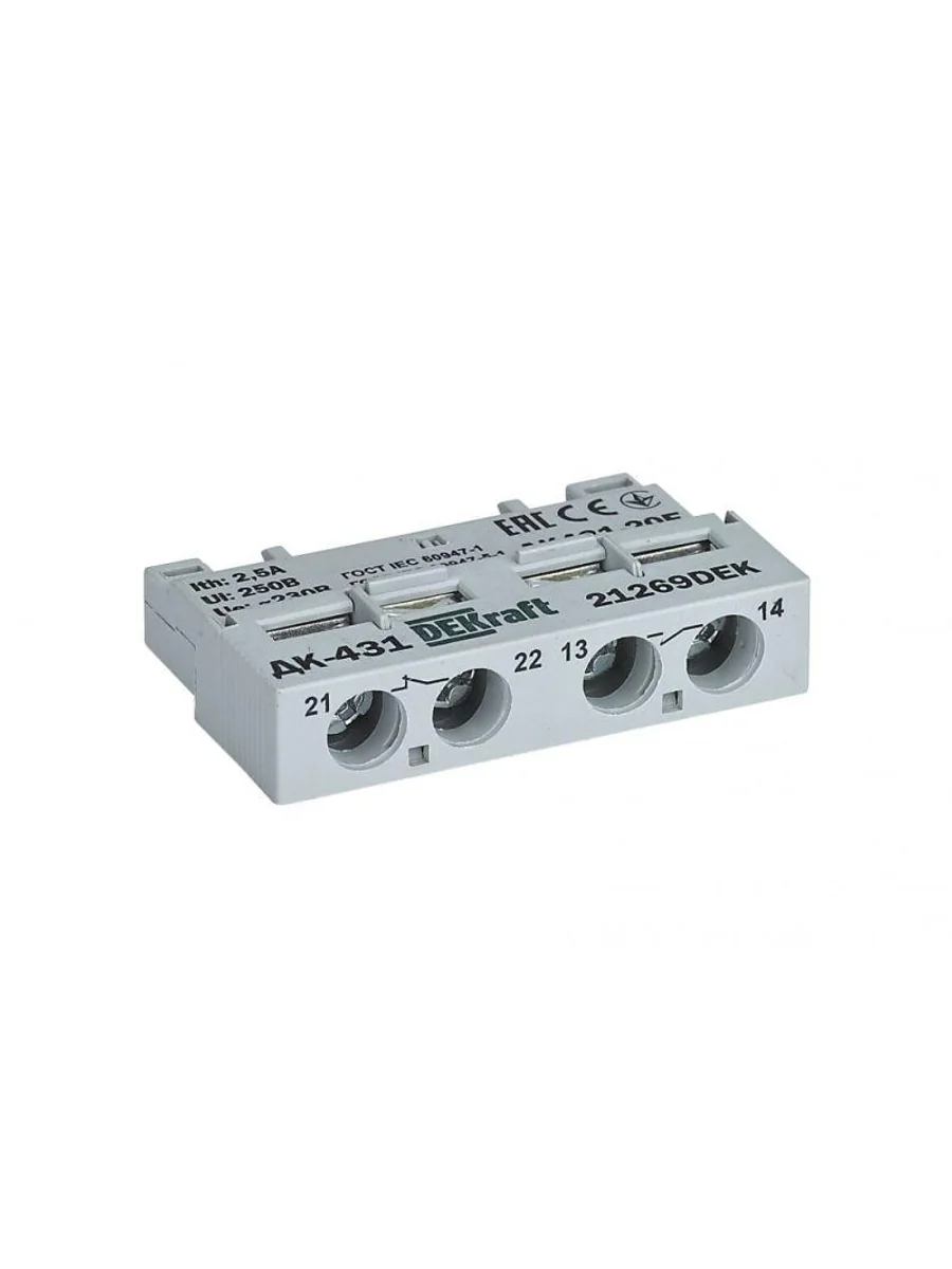 Дополнительные контакты серии ДК-431 F Dekraft; фронтальная установка; кол-во и тип контактов - 1НО+1НЗ; ток терм. стойкости 2,5 А. Дополнительные контакты серии ДК-431 F предназначены для сигнализации о состоянии главных контактов автоматических выключателей ВА-431: включены - выключены. Переключение контактов ДК-431 F происходит, даже если рукоятка управления выключателя удерживается во взведенном положении.