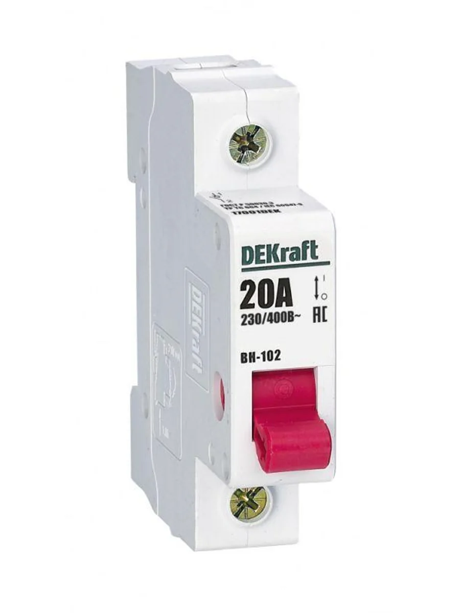 Выключатель-разъединитель серии ВН-102 Dekraft; 1P; номинальный ток 20 А; установка – на DIN-рейку; установочное положение - любое. Выключатели-разъединители применяются для ручного включения/отключения сетей напряжением до 400 В. Специальные мостиковые контакты обеспечивают надежный разрыв цепи; они полностью исключают возможность перекрытия дугой по изоляции. Усиленная рукоятка управления обеспечивает большое количество включений/отключений.