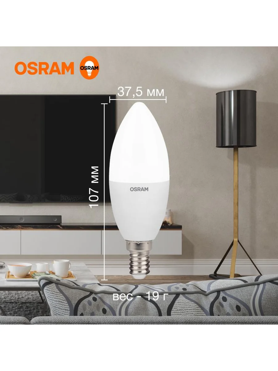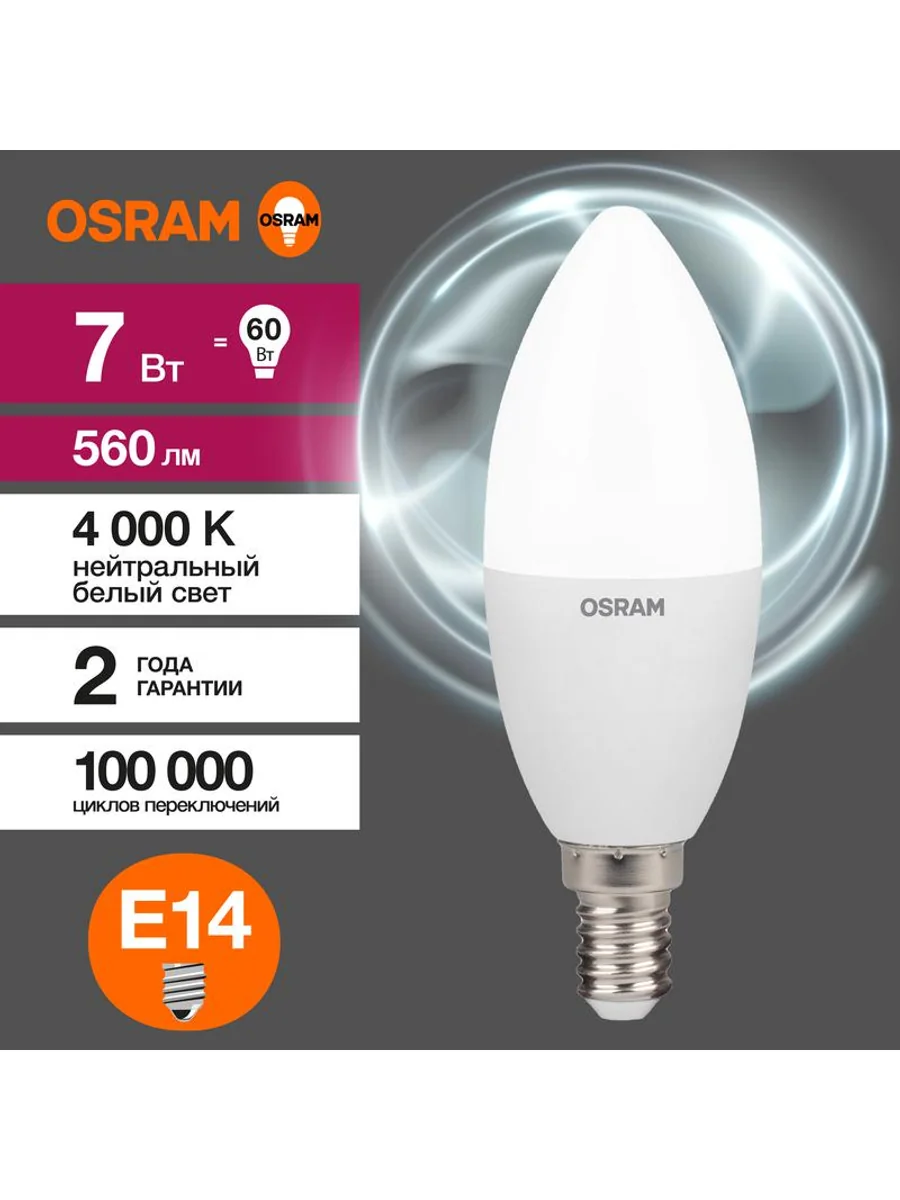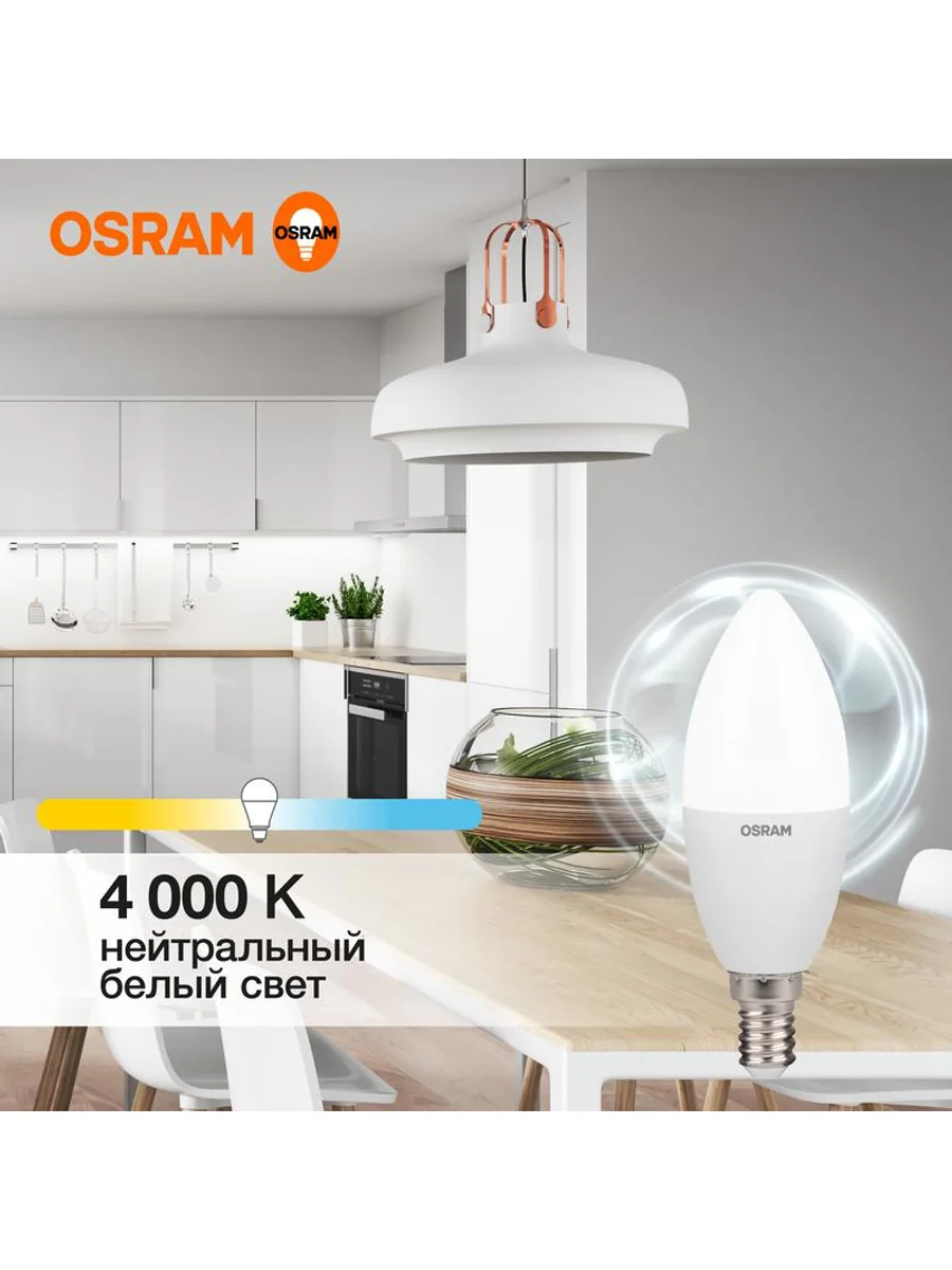 Светодиодные лампы OSRAM - разумная замена традиционным лампам накаливания или галогенным лампам. Светодиодные лампы OSRAM снижают затраты на освещение до 90% при сохранении привычного уровня освещенности. Эта лампа OSRAM серии LED Value выполнена в форме колбы B ("свеча") с цоколем E14. Материал колбы - пластик, исполнение - матовое. Световой поток 560 люмен, что соответствует лампе накаливания на 60 Вт. Такие лампы применяются для внутреннего освещения, хотя в закрытом светильнике можно использовать и на улице. Эта лампа излучает нейтральный белый свет, угол пучка - широкий. Качество света на высоте: низкие пульсации защищают глаза, а высокий индекс цветопередачи позволяет видеть мир в его истинном цвете. Кроме того, лампы OSRAM полностью безопасны для здоровья, поскольку в них нет опасных материалов по европейскому стандарту RoHS, а также они не производят вредных электромагнитных излучений, что подтверждено ЭМС (сертификат электромагнитной совместимости). Лампа проработает долго: срок службы - 25000 часов, 2 года гарантии. Светодиодные лампы OSRAM - умный выбор для здоровья семьи и кошелька!