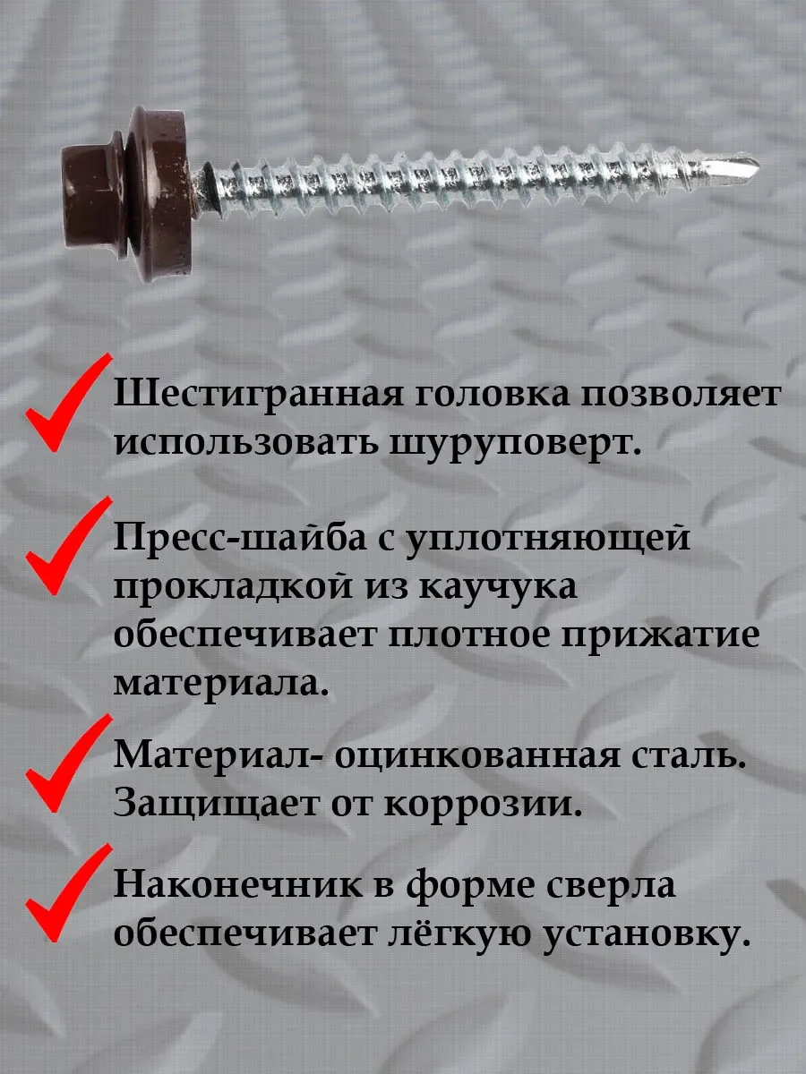 В упаковке 50 штук саморезов. Саморез кровельный с шестигранной головкой и уплотнительной EPDM шайбой размера 4,8х19 предназначен для создания точки резьбового крепления металлических кровельных покрытий к деревянным конструкциям и каркасам. Саморез кровельный служит в качестве элемента точечного крепления для водонепроницаемого соединения типа "металл-дерево". Самосверлящий шуруп кровельного самореза используется для быстрой установки за один этап. Используются для крепления профнастила и металлочерепицы, евроштакетника и других листовых материалов. Покупайте только качественные саморезы кровельные.