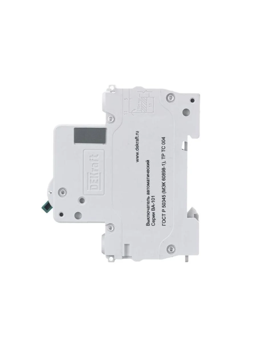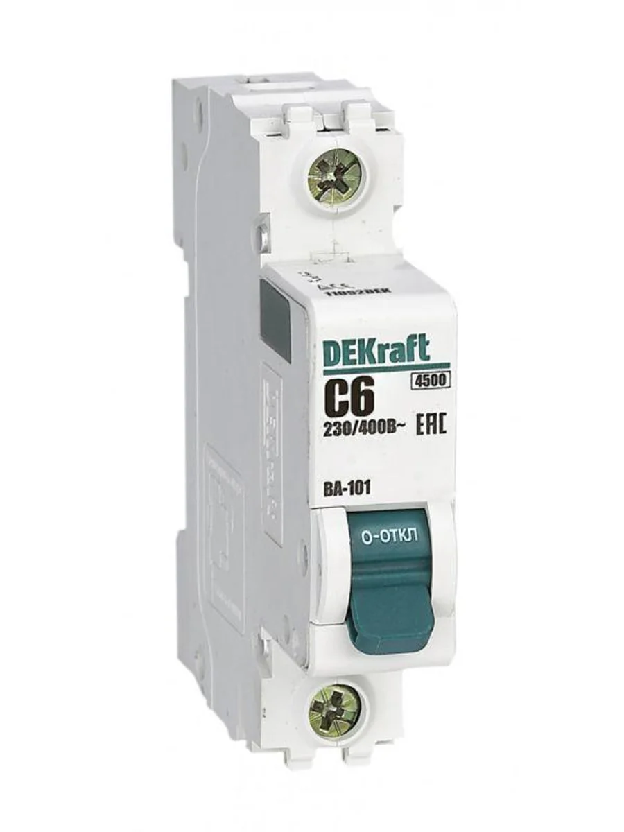 Автоматический выключатель серии ВА-101 Dekraft; 1P; номинальный ток 6 А; характеристика С; отключающая способность 4,5 кА. 5 монолитных заклепок повышают прочность корпуса аппарата. Сплошная лицевая панель обеспечивает безопасность эксплуатации аппарата. Боковые каналы охлаждения повышают стабильность работы при высоких температурах окружающей среды. Есть возможность установки дополнительных аксессуаров с левой стороны устройства. Аппарат на 100% совместим с корпусами Dekraft и Systeme Electric.