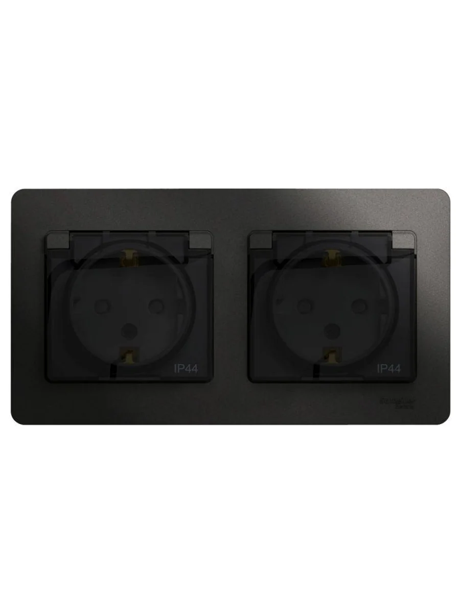 Розетка Systeme Electric (ранее Schneider Electric) серии Glossa (в сборе, цвет антрацит) двойная с заземлением, шторками и крышкой подходит для сетей 250 В, на ток 16 А. - Изделие со степенью защиты IP44 обеспечит безопасность использования в ванной и на кухне. - Заземляющий контакт обеспечивает дополнительную защиту от удара электрическим током. При наличии заземления электрический потенциал уходит в землю, защищая человека. - Выполнен из материала PС+ASA, стойкого к УФ-излучению и появлению царапин.