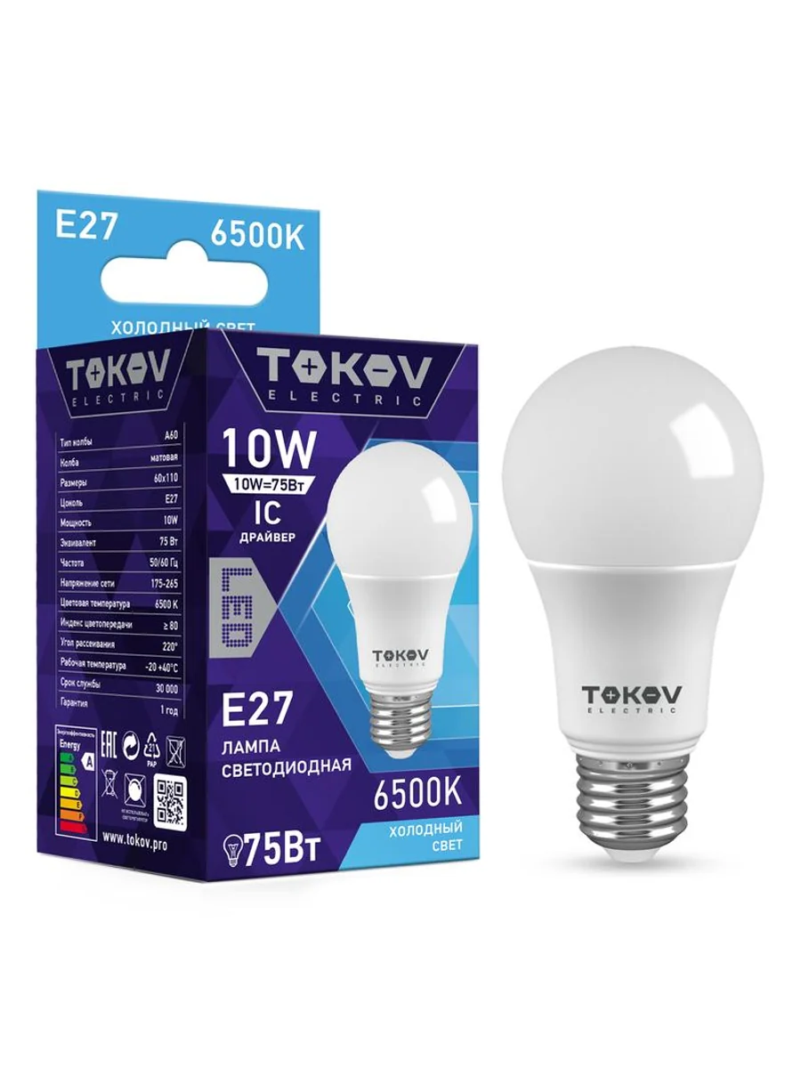 Лампа светодиодная 10Вт А60 6500К Е27 176-264В TOKOV ELECTRIC TKE-A60-E27-10-6.5K