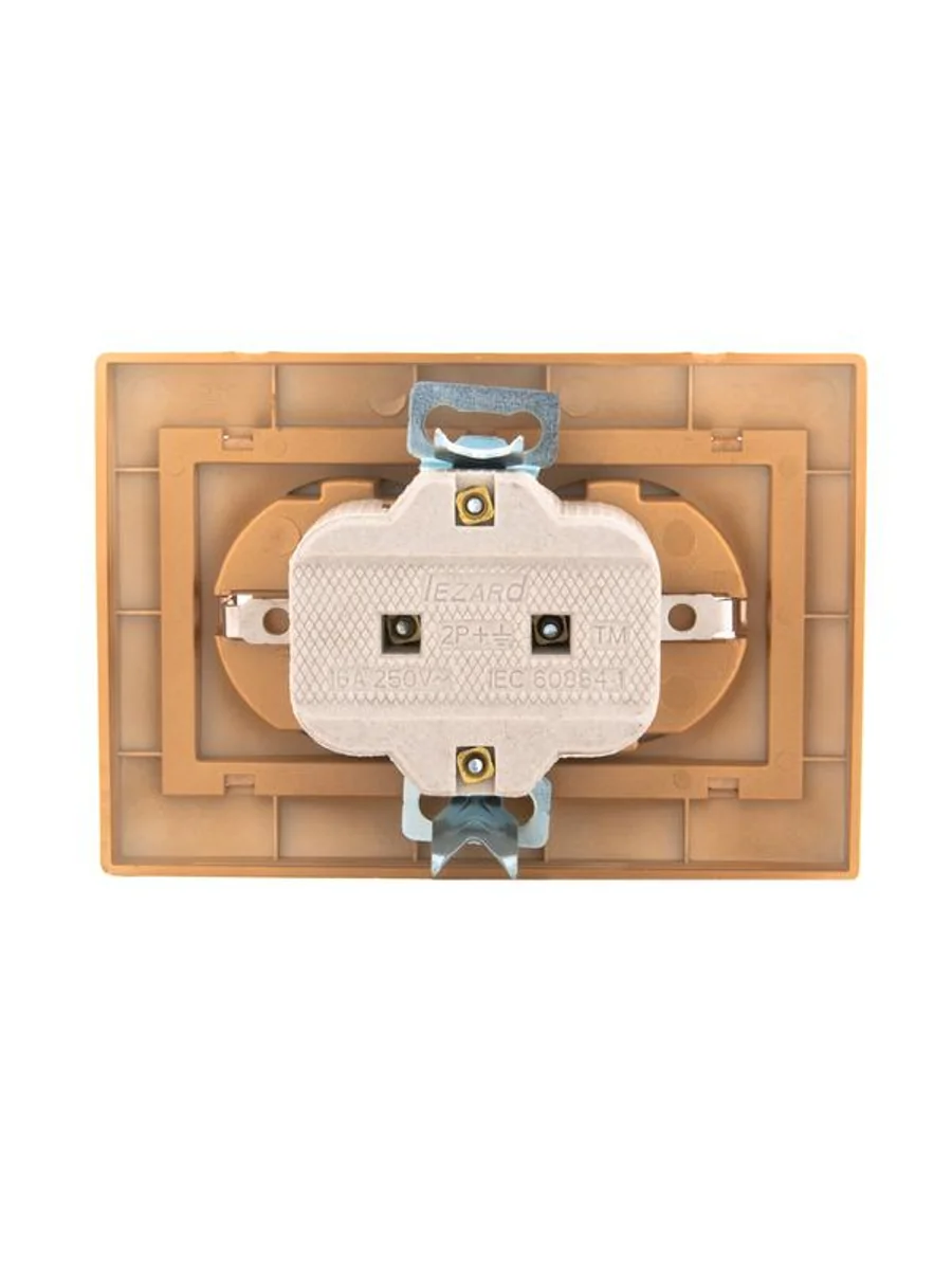 Розетка 2-м СП Мира керам. с заземл. метал. зол. Lezard 701-1313-127 для скрытой установки сочетает в себе гармонию форм с изяществом плавных линий и гладкой фактуры. Изделия данной серии удачно вписываются в самый изысканный интерьер и производят приятное впечатление. Корпус представляет собой форму из негорючего пластика, с керамическим основанием, цвета металлик, декорирована рамкой золотистого цвета. Подпружиненные лапки крепления обеспечивают комфортный и легкий монтаж изделия. Предусмотрена возможность установки без применения монтажной коробки. Монтируется на одном уровне с поверхностью стены. Рекомендованы для жилых помещений и административных зданий.