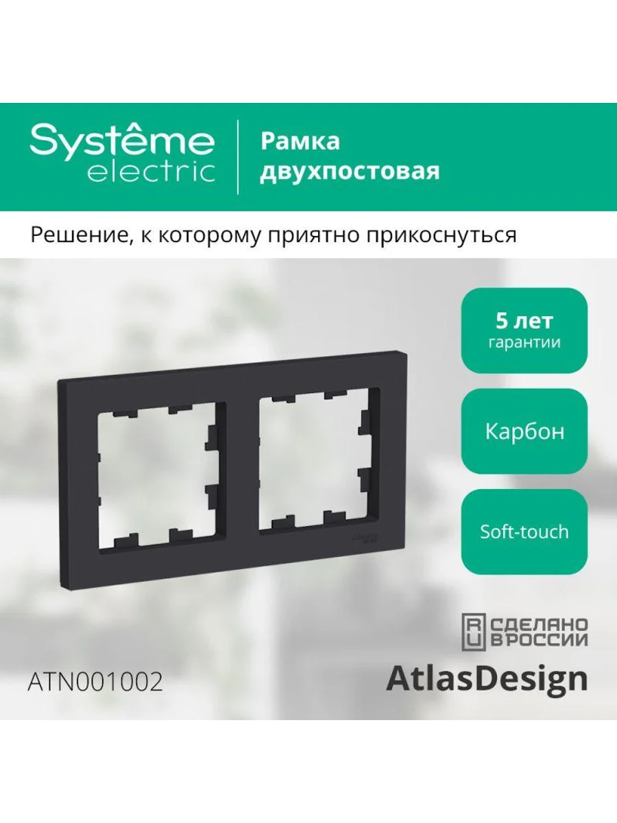Рамка Systeme Electric (ранее Schneider Electric) серии AtlasDesign в цвете карбон двухместная. Устанавливается в вертикальном и горизонтальном положениях. Лицевые детали из качественного ABS-пластика, устойчивого к царапинам и УФ-излучению. Позволяет гармонично вписать электроустановочное изделие в интерьер помещения. Благодаря покрытию «soft touch» к изделию приятно прикасаться.