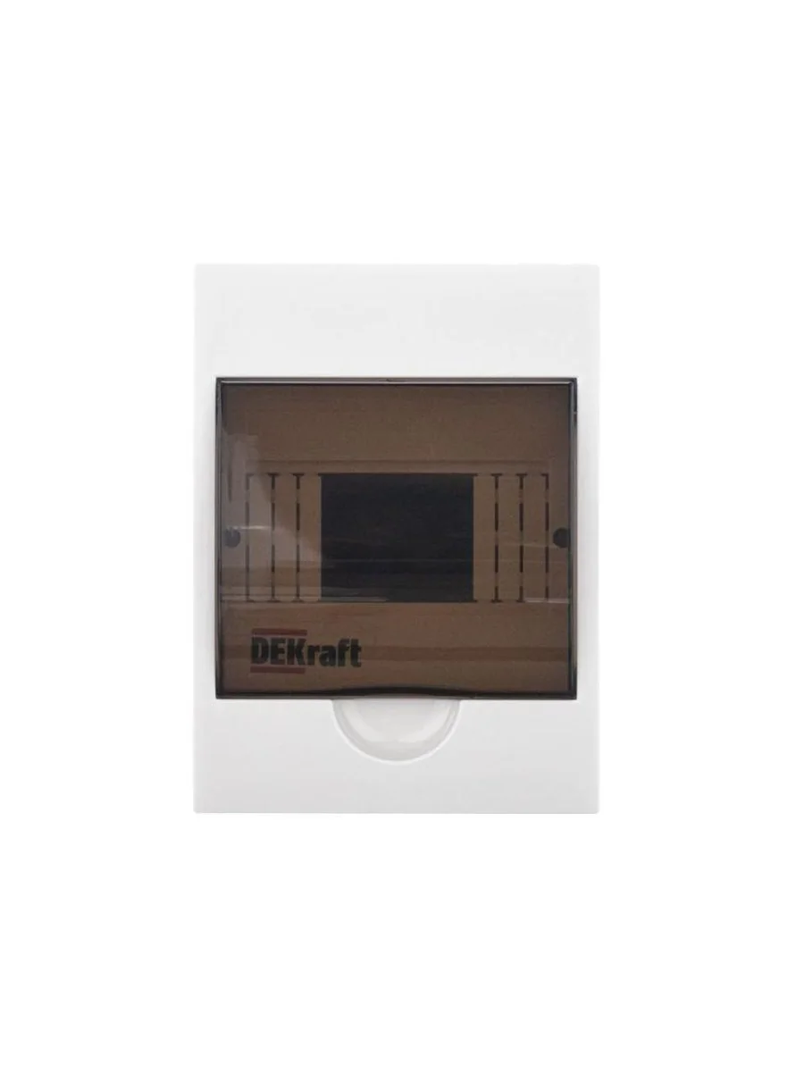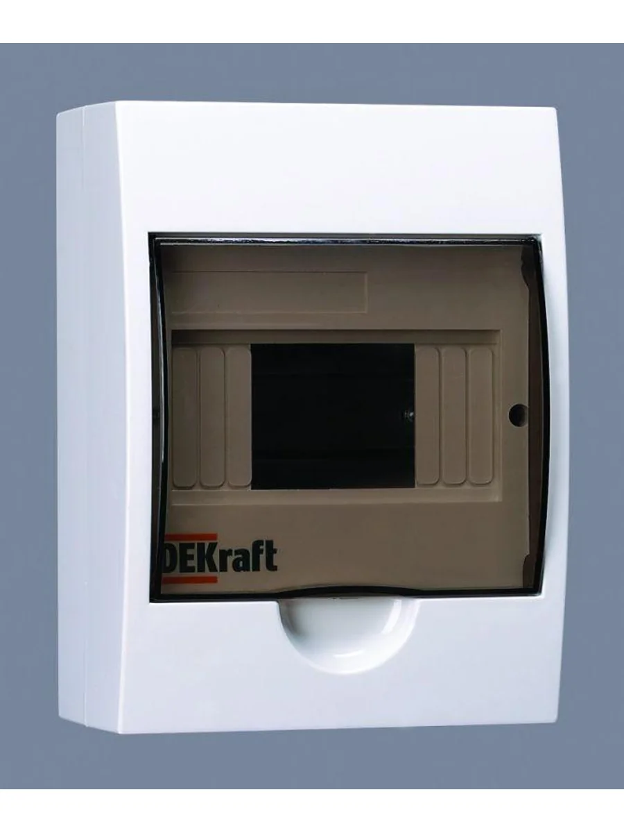 Корпус пластиковый навесной для электрических аппаратов серии ЩРН-П IP41 используют для установки в них модульной защитной аппаратуры. Дизайн корпуса имеет элегантные и скругленные формы, как и дверца, ее цвет темное органическое стекло. Фронтальные части корпуса, дверца, основание корпуса изготавливаются из самозатухающего ABS-пластика. Корпус имеет штампованные вводы для кабелей с разных сторон, и расстояния до точек крепления указаны сзади. Корпус является встраиваемым, имеет 1 черную DIN-рейку и 6 модулей (18 мм) для установки устройств, изолированный держатель для шинок, шинки N и PE. Дверца фиксируется в верхнем положении. Щиток на 100% совместим с модульным оборудованием Dekraft и Systeme Electric.