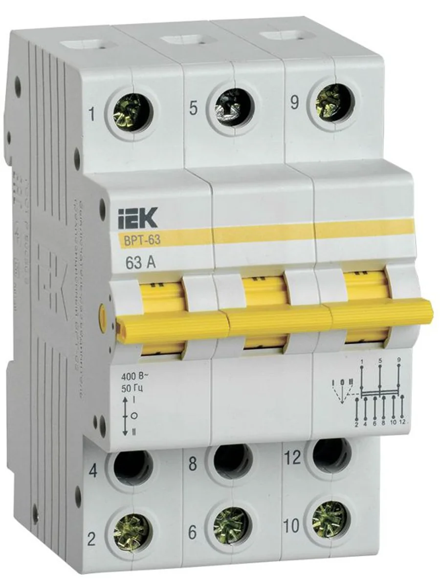 Выключатель-разъединитель трехпозиционный ВРТ-63 предназначен для коммутации смешанных активных и индуктивных нагрузок в цепях переменного тока напряжением до 400 В частотой 50 Гц. Применяется в качестве учетно-распределительного оборудования жилых и общественных зданий и сооружений, где предусматривается необходимость в оперативном отключении от сети отдельных групп электропотребителей или участков электрокоммуникации.