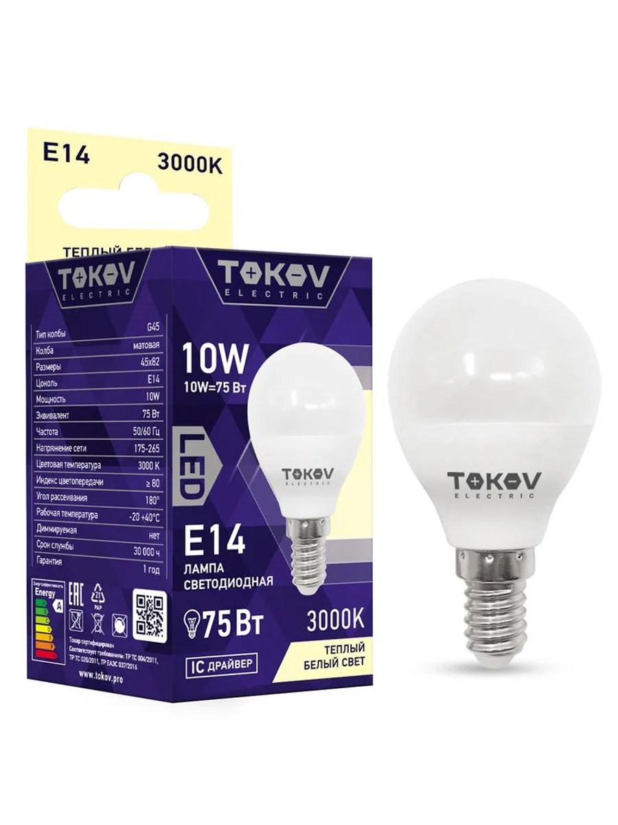 Лампа светодиодная 10Вт G45 3000К Е14 176-264В TOKOV ELECTRIC TKE-G45-E14-10-3K - купить в KeepBuilding | KeepBuilding