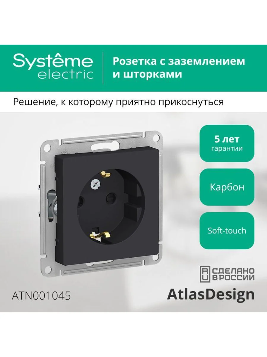 Механизм Systeme Electric (ранее Schneider Electric) серии AtlasDesign в цвете карбон розетки одинарной с заземлением и шторками подходит для сетей 250 В, на ток 16 А. Заземляющий контакт обеспечивает дополнительную защиту от удара электрическим током. При наличии заземления электрический потенциал уходит в землю, защищая человека. Лицевые детали из качественного ABS-пластика, устойчивого к царапинам и УФ-излучению. Благодаря покрытию «soft touch» к изделию приятно прикасаться.
