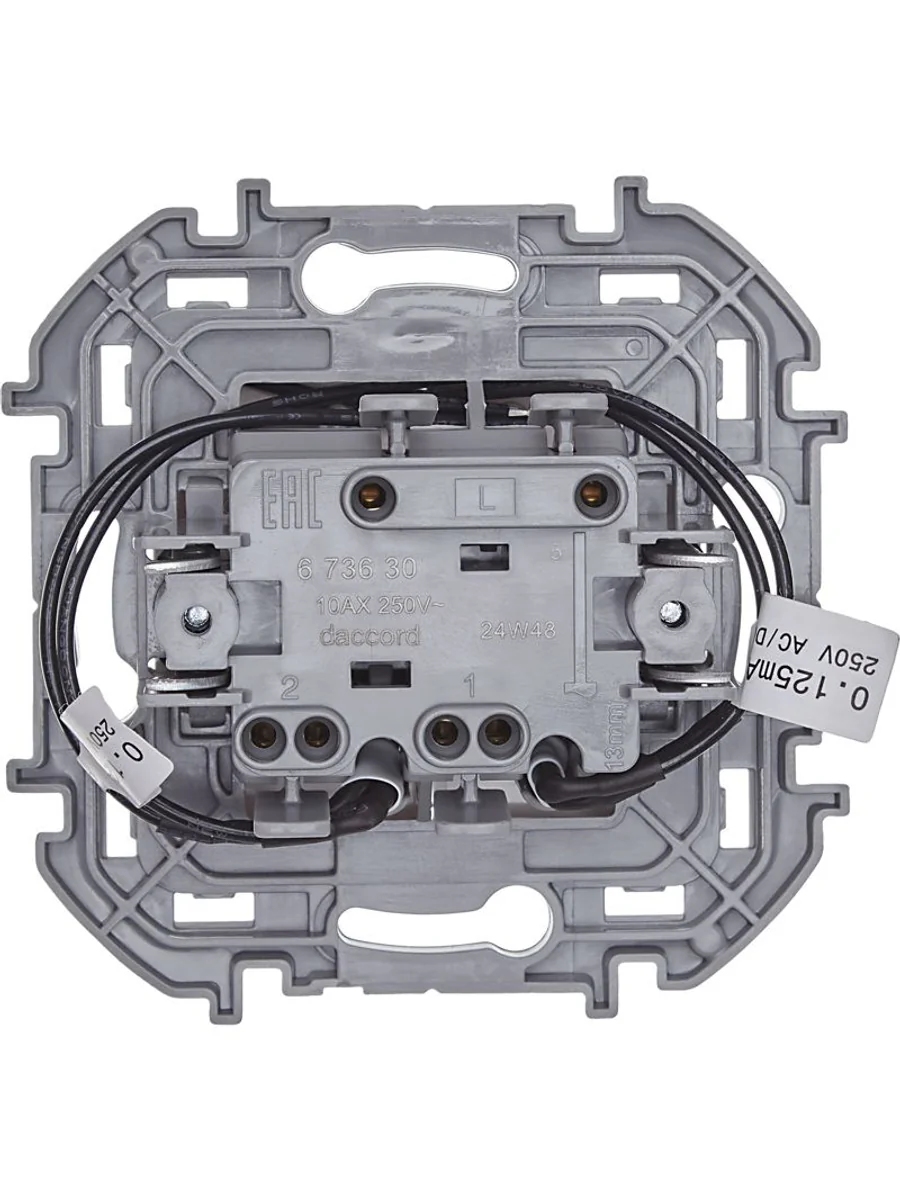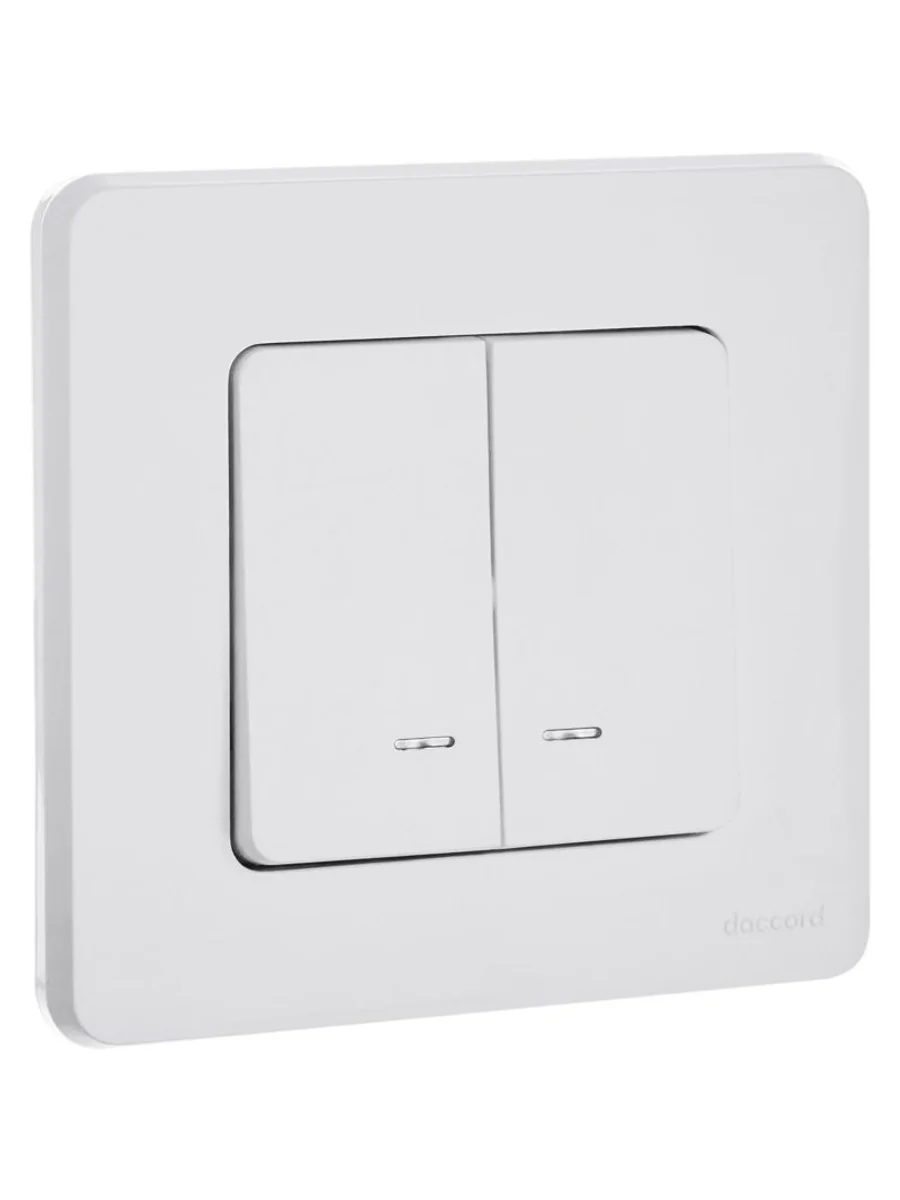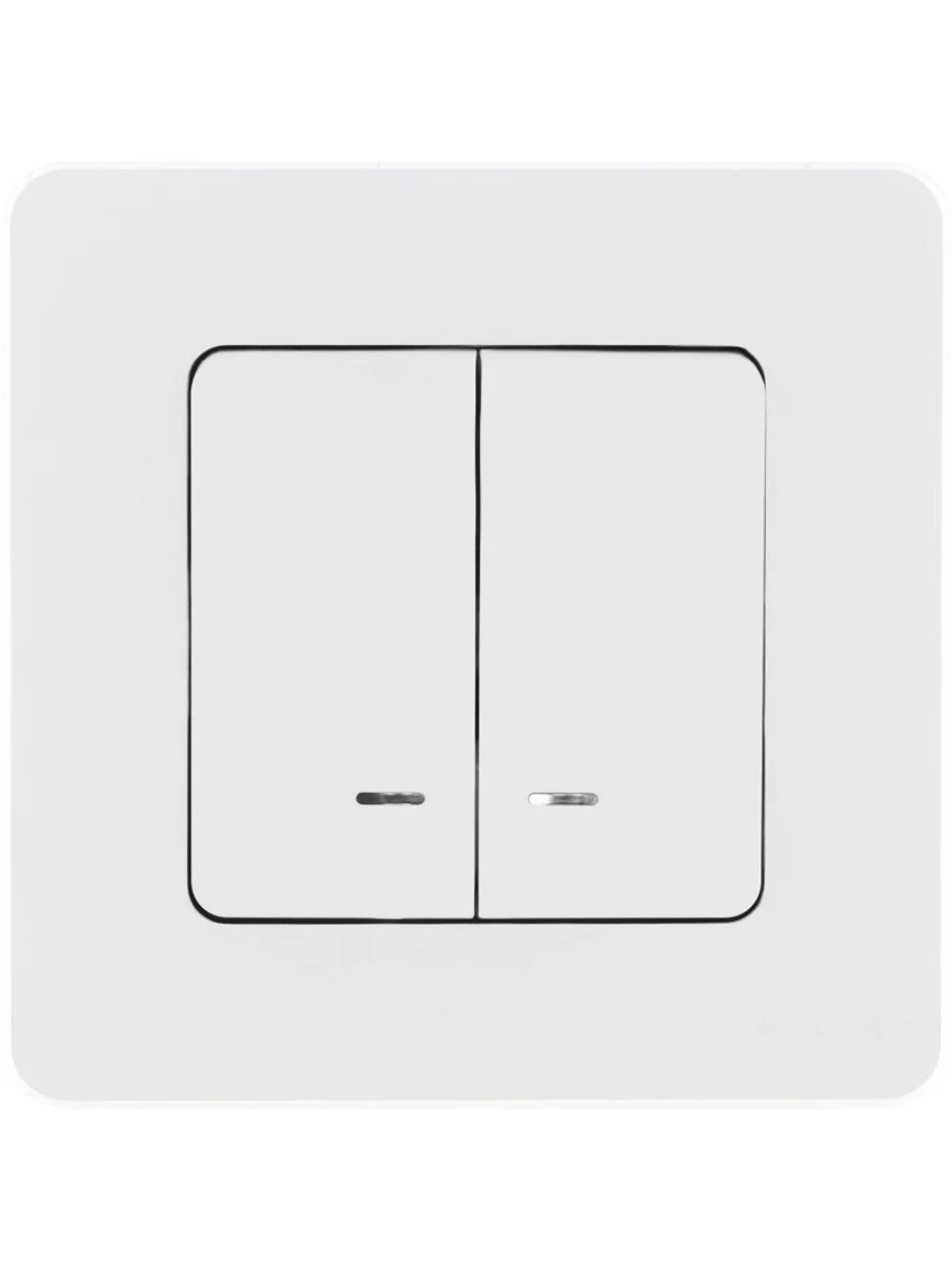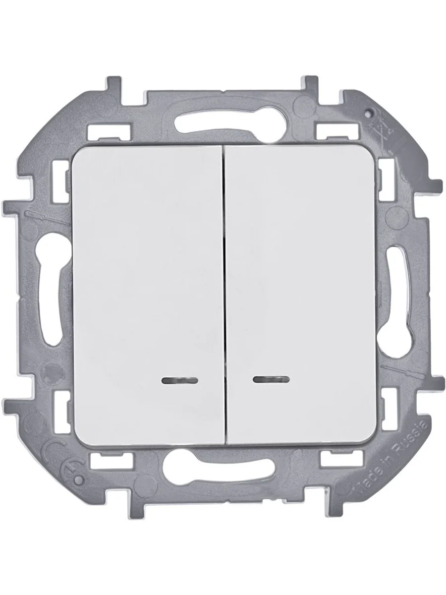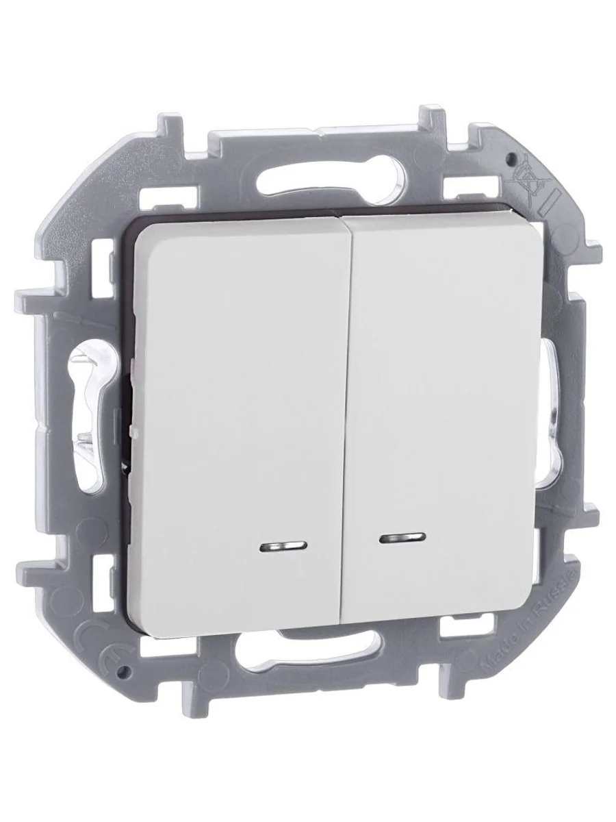 Выключатель двухклавишный с подсветкой/индикацией скрытого монтажа Inspiria, цвет "Белый", номинальный ток 10АХ, напряжение ~250В, безвинтовые зажимы. Устанавливается в жилых и общественных помещениях для управления приборами освещения, вентиляции и т.д. Предназначен для управления двумя электрическими цепями.