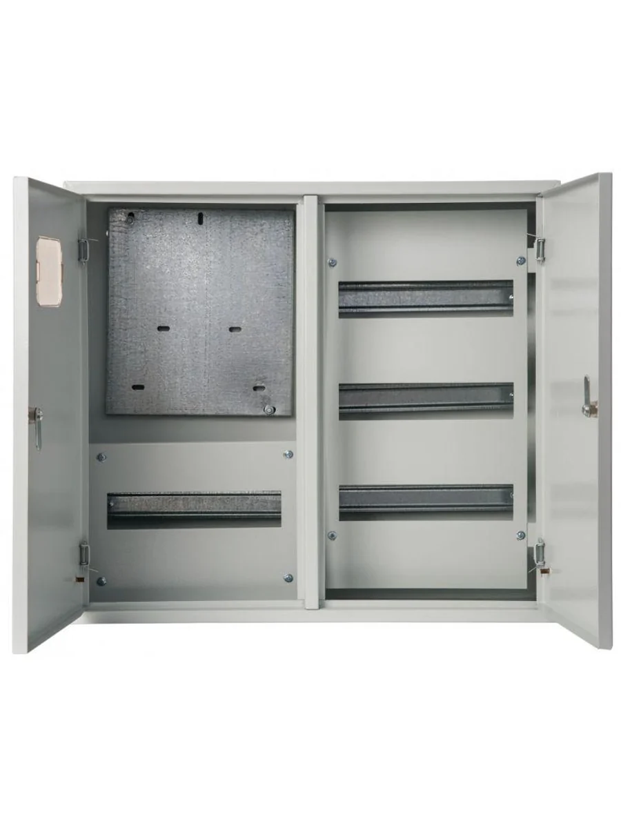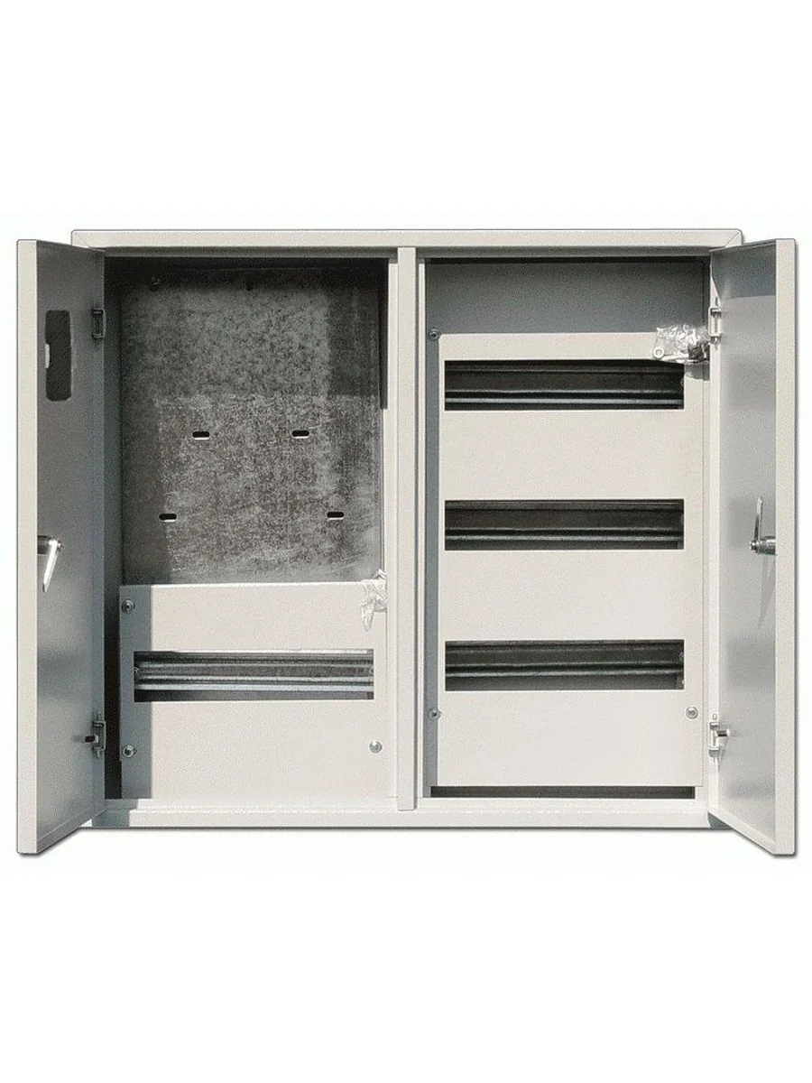 Щит распределительный учетный серии ЩРУН Dekraft; навесной; для трехфазного счетчика; номинальный ток до 125 А; исполнение – 48 мод. х 18 мм, 3+1 ряда; ВхШхГ - 520х585х160 мм; материал – сталь; цвет - серый (RAL 7032); степень защиты - IP31. Щиты ЩРУН имеют монтажную панель для крепления счетчика, DIN-рейки для модульной аппаратуры, элементы крепления шин N и PE, болты заземления на дверце и на корпусе, дверь с замком и ключом. Ввод кабелей для всех щитов осуществляется сверху или снизу.