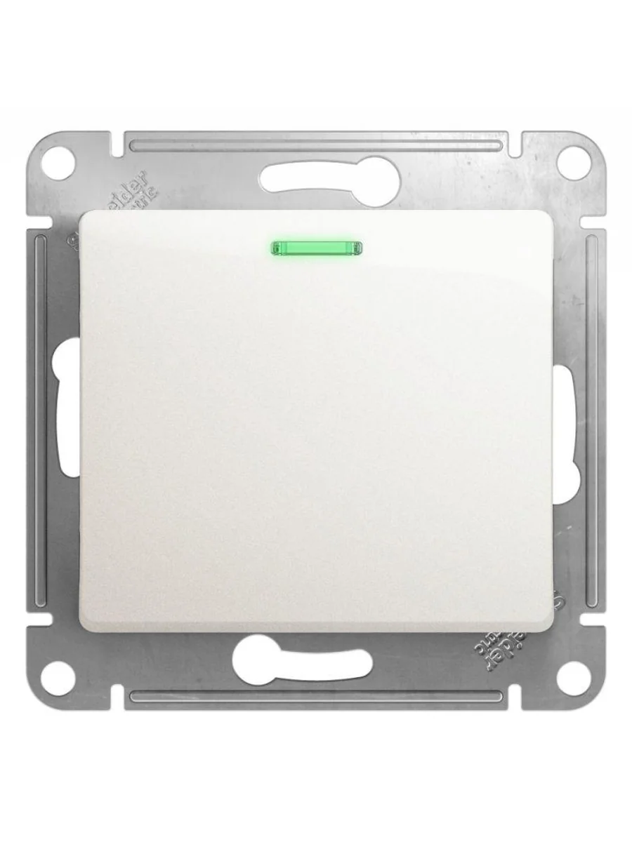 Механизм Systeme Electric (ранее Schneider Electric) серии Glossa (цвет перламутр) переключателя 1-клавишного с подсветкой подходит для сетей 250 В, на ток 10 А. - Благодаря современной светодиодной подсветке зеленого цвета изделие легко найти в темноте. - Переключатель позволяют управлять одним источником света с двух точек. - Выполнен из материала PС+ASA, стойкого к УФ-излучению и появлению царапин. - Эргономичные клеммы расположены в два ряда: сверху и снизу.
