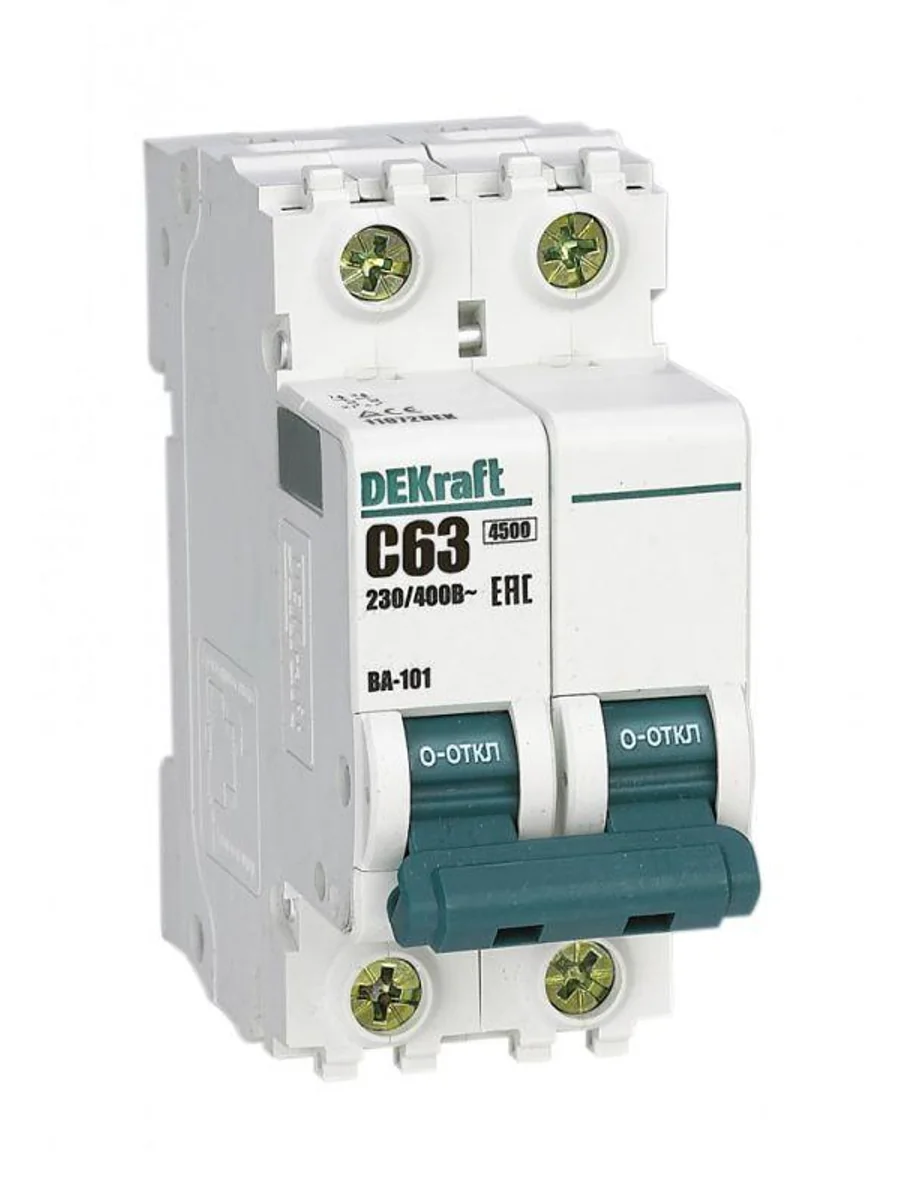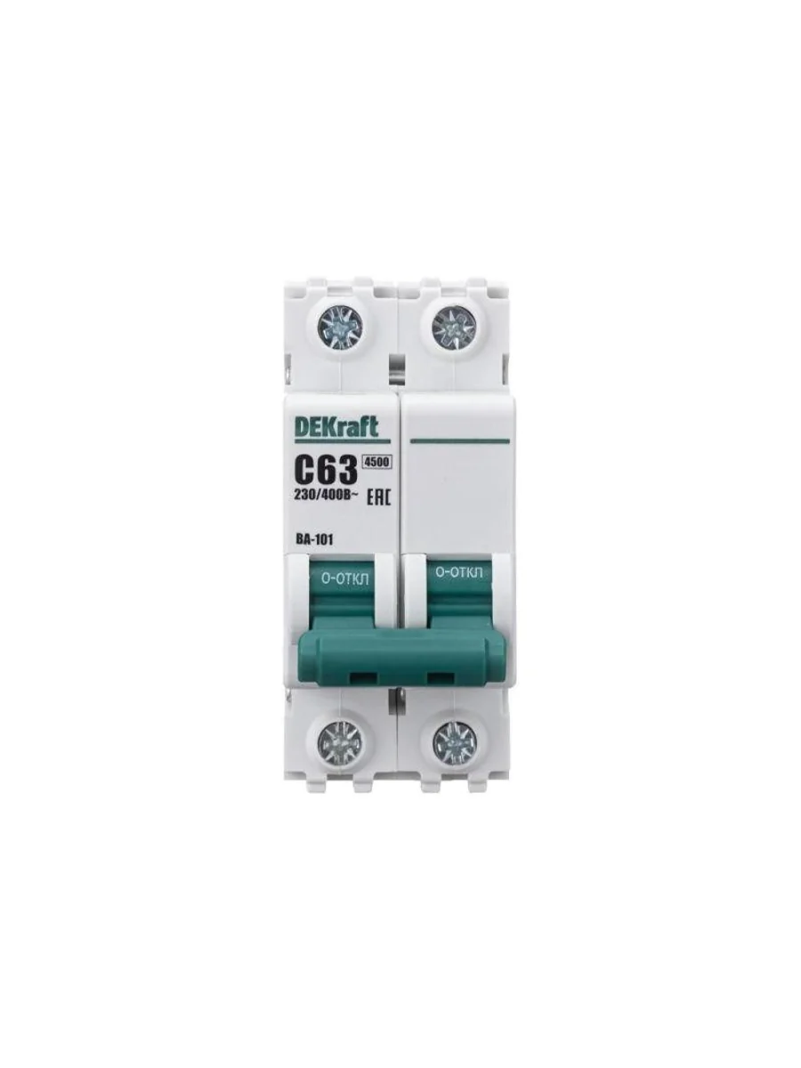 Автоматический выключатель серии ВА-101 Dekraft; 2P; номинальный ток 63 А; характеристика С; отключающая способность 4,5 кА. 5 монолитных заклепок повышают прочность корпуса аппарата. Сплошная лицевая панель обеспечивает безопасность эксплуатации аппарата. Боковые каналы охлаждения повышают стабильность работы при высоких температурах окружающей среды. Есть возможность установки дополнительных аксессуаров с левой стороны устройства. Аппарат на 100% совместим с корпусами Dekraft и Systeme Electric.