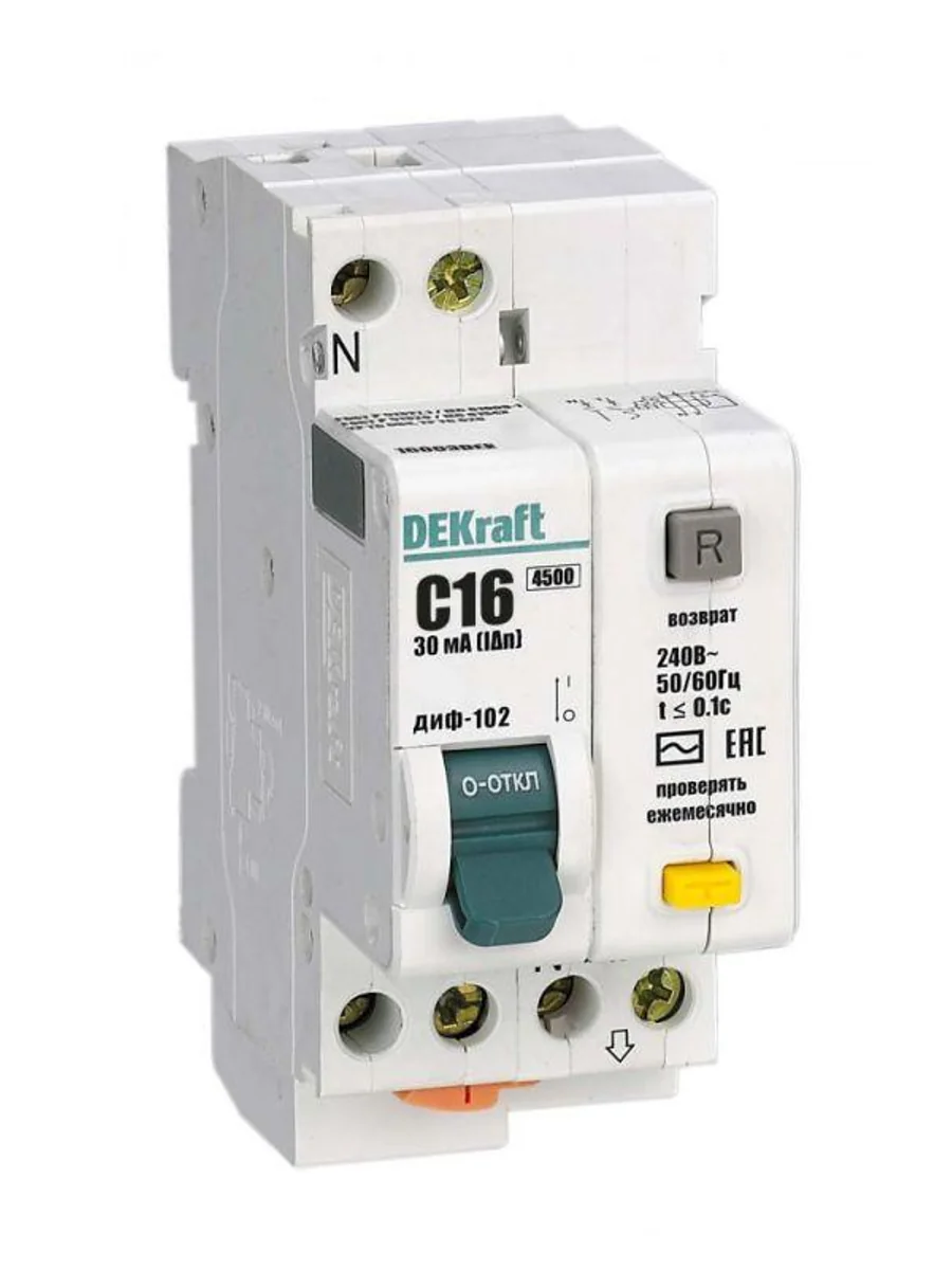 Автоматический выключатель дифференциального тока серии ДИФ-102 Dekraft; 1P+N; ном.ток 16 А; характеристика C; откл.способность Icn = 4,5 kA; ток утечки 30 мА; тип - АС; блок дифф.защиты – электронный; ширина – 2 мод. х 18 мм; монтаж – на DIN-рейку. АВДТ применяются в сетях напряжением до 220 В пер.тока для защиты человека от поражения электрическим током и электроустановок от сверхтоков и токов утечки. Аппараты ДИФ-102 являются более компактным вариантом АВДТ по сравнению с серией ДИФ-101.