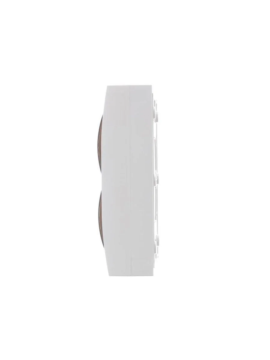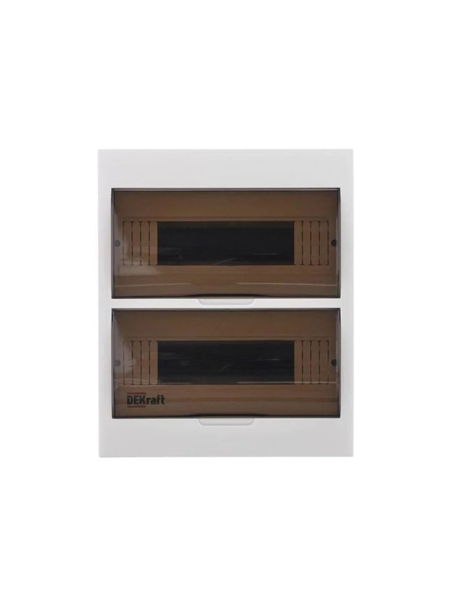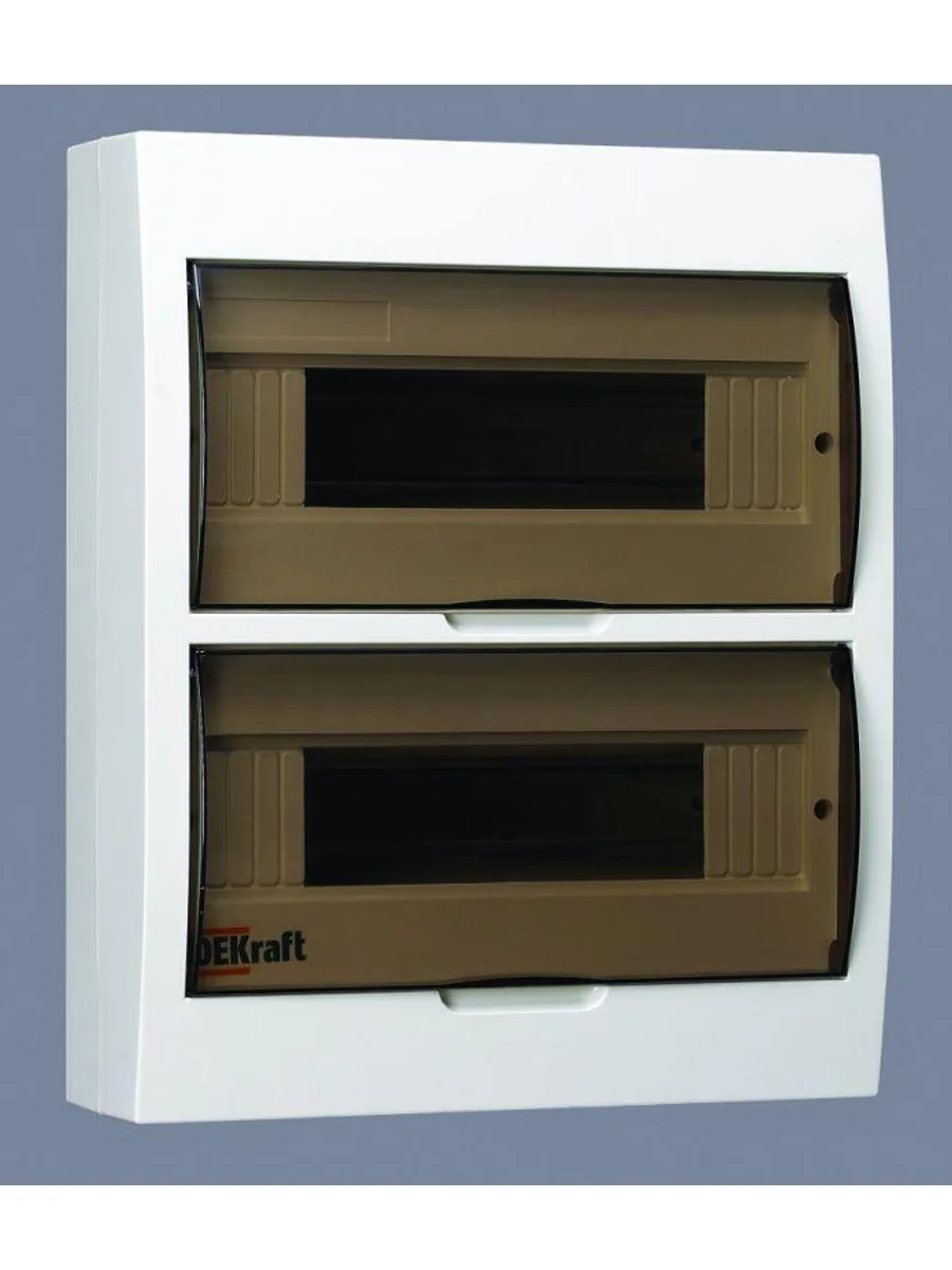 Корпус пластиковый навесной для электрических аппаратов серии ЩРН-П IP41 используют для установки в них модульной защитной аппаратуры. Дизайн корпуса имеет элегантные и скругленные формы, как и дверца, ее цвет темное органическое стекло. Фронтальные части корпуса, дверца, основание корпуса изготавливаются из самозатухающего ABS-пластика. Корпус имеет штампованные вводы для кабелей с разных сторон, и расстояния до точек крепления указаны сзади. Корпус является встраиваемым, имеет 2 черных DIN-рейки и 24 модулей (18 мм) для установки устройств, изолированные держатели для шинок, шинки N и PE. Дверцы на каждый ряд фиксируются в верхнем положении. Щиток на 100% совместим с модульным оборудованием Dekraft и Systeme Electric.