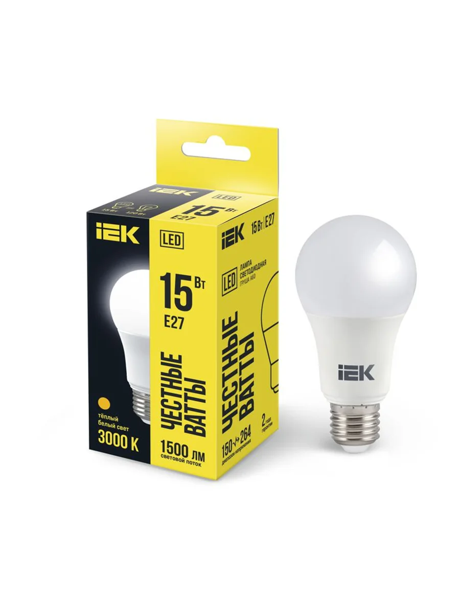 Лампа LED A60 груша 15Вт 230В 3000К E27 IEK предназначена для использования в осветительных приборах наружного и внутреннего освещения объектов промышленного, коммерческого и бытового назначения. Соответствует требованиям Технических регламентов Таможенного союза ТР ТС 004/2011, ТР ТС 020/2011, МЭК 62560, Постановления Правительства РФ от 10.11.2017 № 1356.