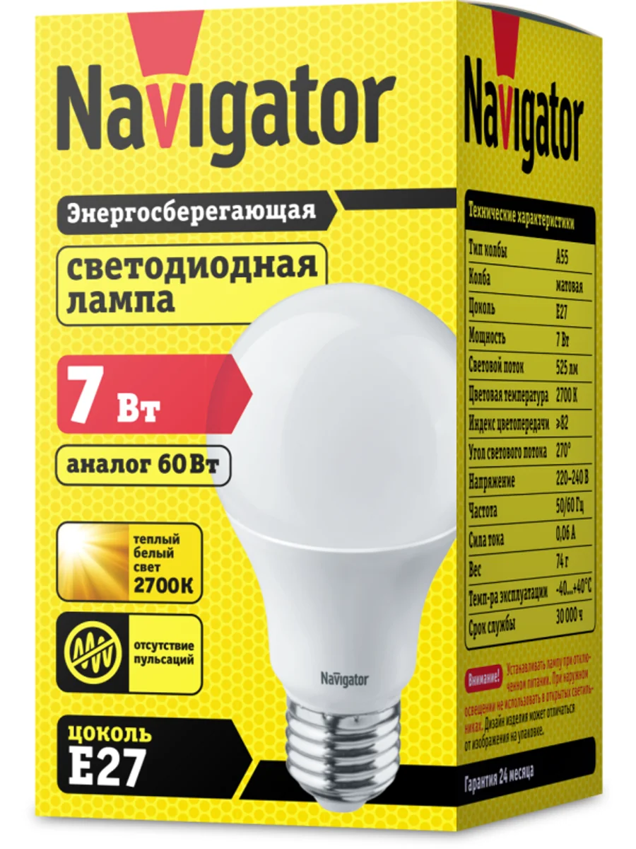 Лампа светодиодная 94 385 NLL-A60/A55-7-230-2.7K-E27 7Вт грушевидная 2700К тепл. бел. E27 525лм 176-264В Navigator 94385 - купить в KeepBuilding | KeepBuilding