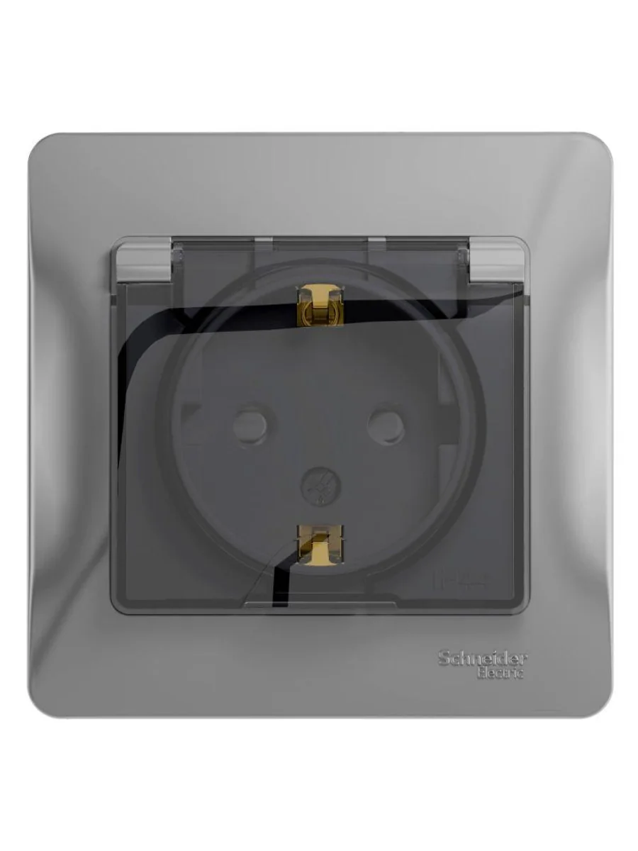 Розетка Systeme Electric (ранее Schneider Electric) серии Glossa (в сборе, цвет алюминий) одинарная с заземлением, шторками и крышкой подходит для сетей 250 В, на ток 16 А. - Изделие со степенью защиты IP44 обеспечит безопасность использования в ванной и на кухне. - Заземляющий контакт обеспечивает дополнительную защиту от удара электрическим током. При наличии заземления электрический потенциал уходит в землю, защищая человека. - Выполнен из материала PС+ASA, стойкого к УФ-излучению и появлению царапин.