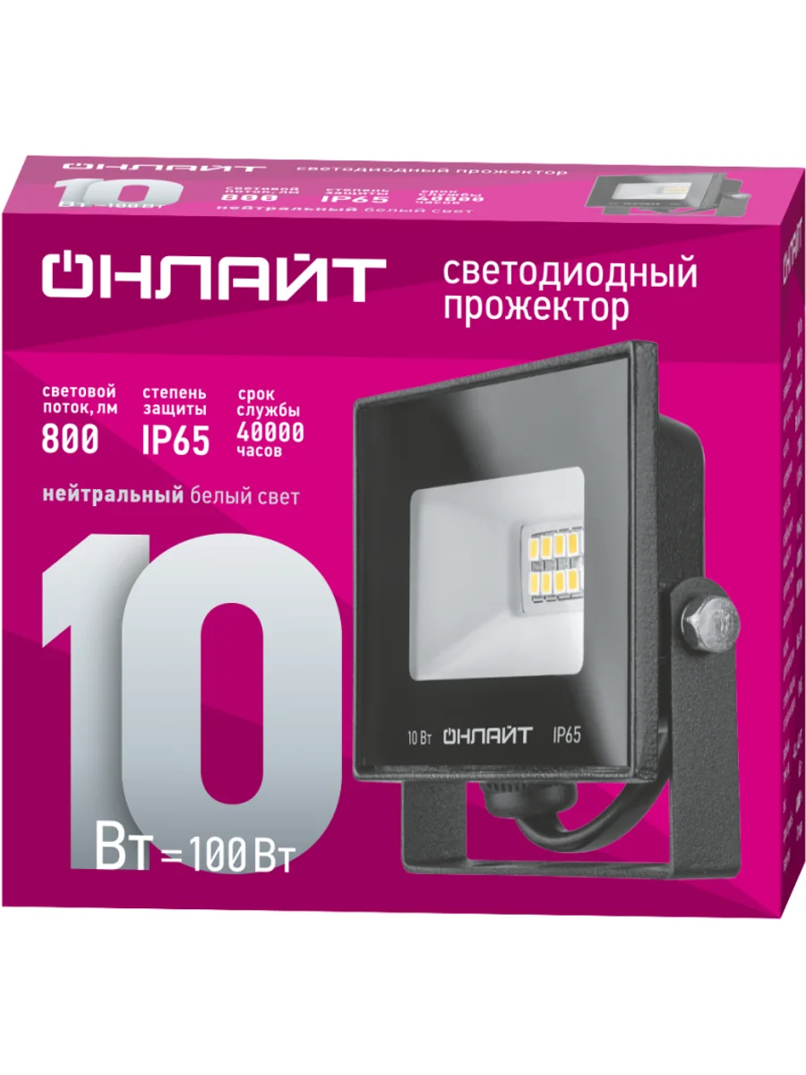 Прожектор 71 656 OFL-10-4K-BL-IP65-LED LED 10Вт IP65 4000К ОНЛАЙТ 19196 является аналогом галогенного прожектора мощностью 100 Вт. Корпус и рефлектор изготовлены из алюминиевого сплава. Рекомендуется к применению как средство наружного освещения (дворов и придомовых территорий, билбордов, стендов), так и внутреннего освещения, в помещении, для освещения витрин, залов, галерей, складов, гаражей.