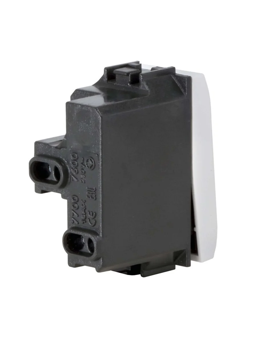 Выключатель. Назначение: включение/выключение освещения. Характеристики: номинальный ток - 16 А; номинальное напряжение - 250 B. Кол-во модулей: 1. Цвет: белый.