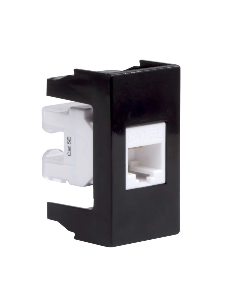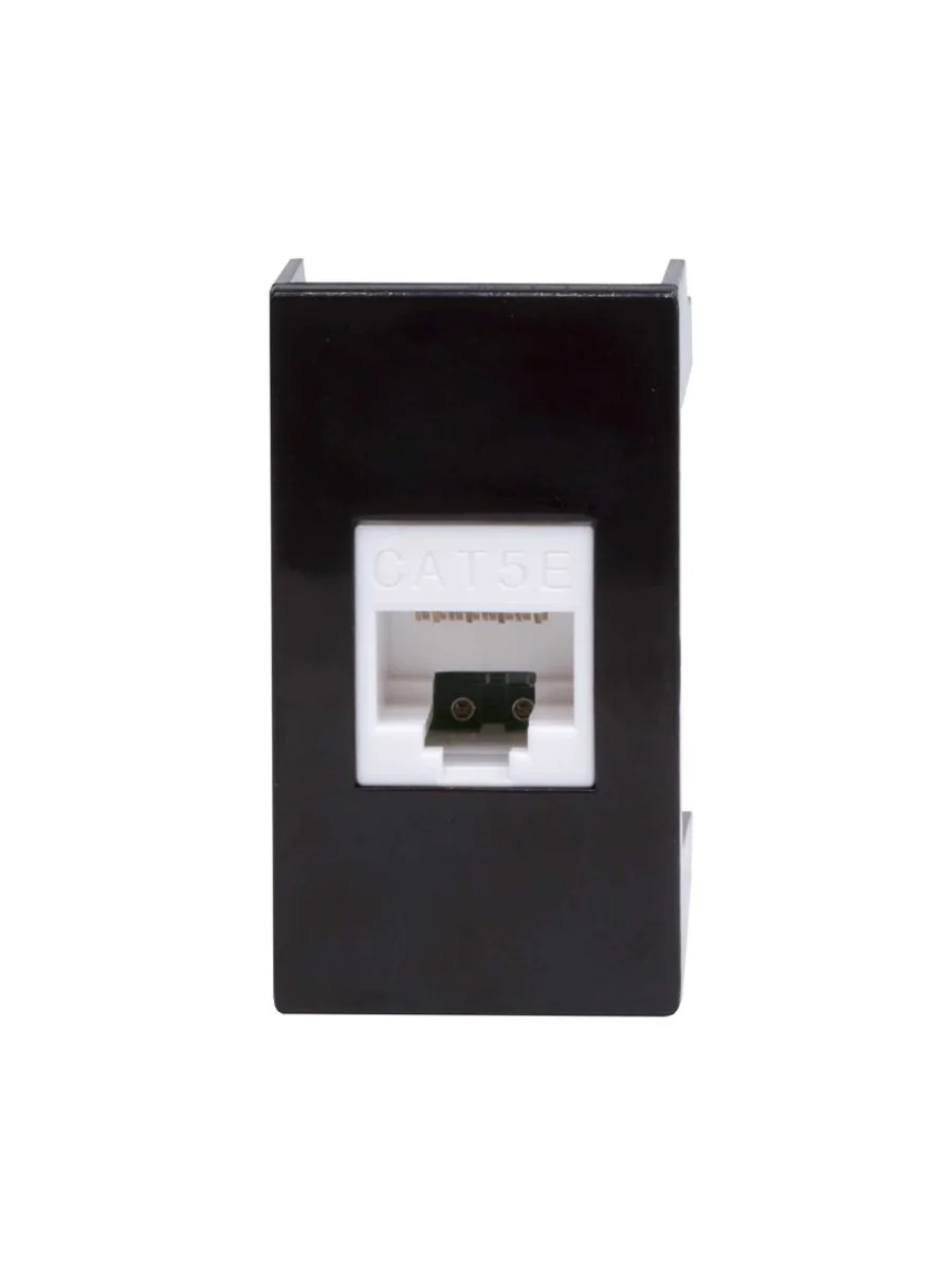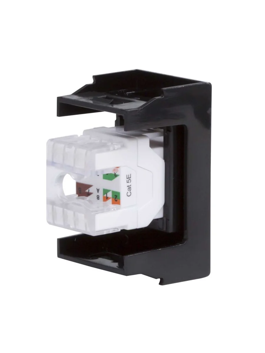 Компьютерная розетка. Назначение: подсоединение кабеля к компьютеру, принтеру и прочей оргтехнике. Характеристики: 8Р8С; комплектуются одномодульным гнездом; для заделки контактов в розетки использовать инструмент типа 110. RJ-45. Категория: 5е. Тип гнезда: Keystone. Производитель гнезда: Hyperline. Установочный размер: 45х25. Кол-во модулей: 1. Цвет: черный