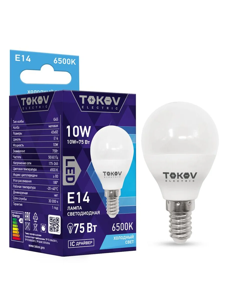 Лампа светодиодная 10Вт G45 6500К Е14 176-264В TOKOV ELECTRIC TKE-G45-E14-10-6.5K - купить в KeepBuilding | KeepBuilding