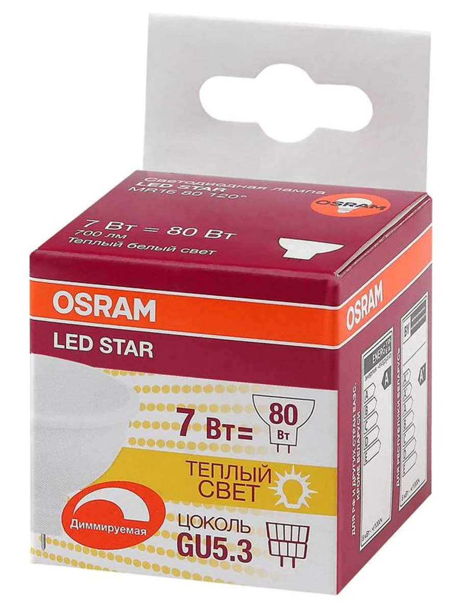 Светодиодные лампы OSRAM - разумная замена традиционным лампам накаливания или галогенным лампам. Светодиодные лампы OSRAM снижают затраты на освещение до 90% при сохранении привычного уровня освещенности. Эта лампа OSRAM серии LED Star выполнена в форме колбы MR16 с цоколем GU5.3. Материал колбы - пластик, исполнение - матовое. Световой поток 600 люмен, что соответствует лампе накаливания на 80 Вт. Подобные лампы (их еще называют споты) используются для внутреннего освещения. Особенно часто их используют для освещения ванных комнат внутри закрытого светильника. Эта лампа излучает теплый белый свет, угол пучка - узкий. Качество света на высоте: низкие пульсации защищают глаза, а высокий индекс цветопередачи позволяет видеть мир в его истинном цвете. Кроме того, лампы OSRAM полностью безопасны для здоровья, поскольку в них нет опасных материалов по европейскому стандарту RoHS, а также они не производят вредных электромагнитных излучений, что подтверждено ЭМС (сертификат электромагнитной совместимости). Лампа проработает долго: срок службы - 15000 часов, 2 года гарантии. Светодиодные лампы OSRAM - умный выбор для здоровья семьи и кошелька!