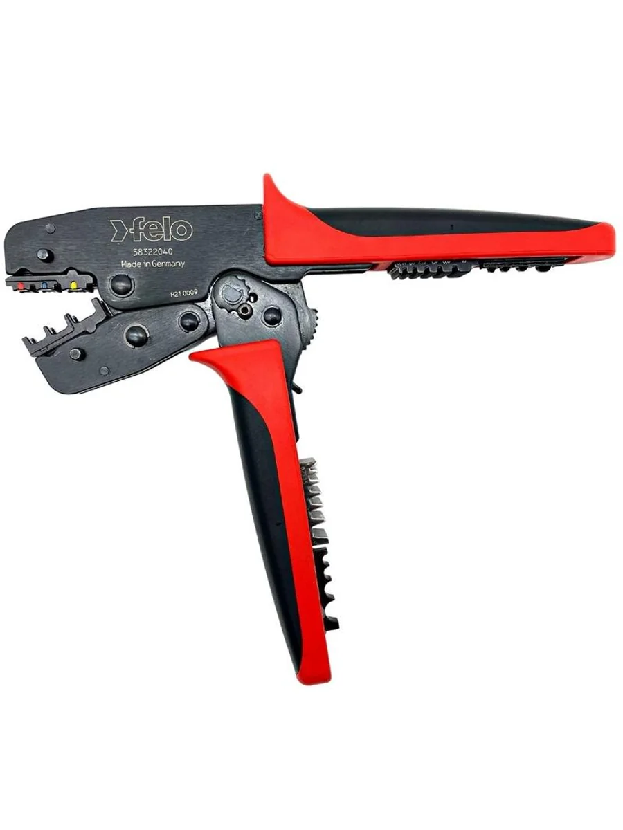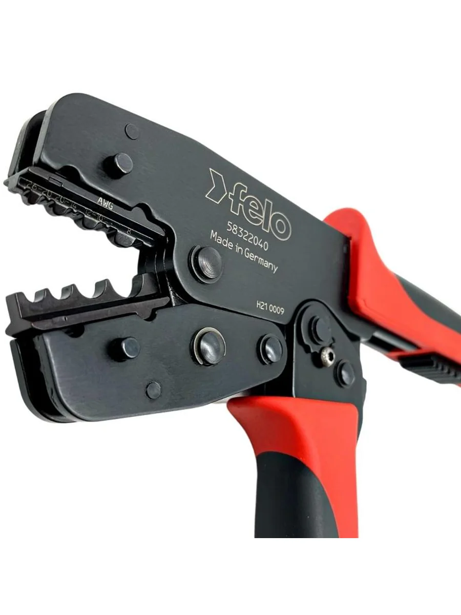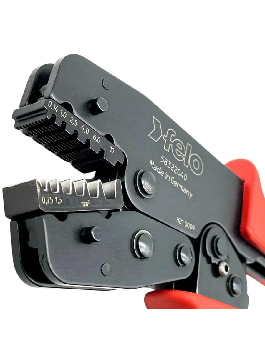 Пресс-клещи FELO 58322040 предназначены для опрессовки штекеров и кабельных, кольцевых наконечников. Инструмент имеет долгий срок службы, так как изготовлен из хромованадиевой инструментальной стали, закаленной в масле. Инструмент оснащен пружиной для быстрого раскрытия. Передаточная многорычажная система позволяет передавать на инструмент большое усилие при работе. Сменные насадки в комплекте пресс-клещей позволяют работать им методом овального обжима в диапазоне от 0,75 до 10 кв.мм. 1 Матрица: для обработки кабельных наконечников DIN с красной/синей/желтой изоляцией, штыревые кабельные наконечники, плоские вилки, плоские розетки, круглые штекеры, круглые розетки, стыковые и параллельные разъемы Профиль 1: красный 0,5-1,0 кв.мм Профиль 2: синий 1,5-2,5 кв.мм Профиль 3: 4,0-6,0 кв.мм 2 Матрица: для обработки наконечников проводов без изолирующей манжеты согласно DIN 46228, диапазон сечений 0,14 - 10,0 кв.мм 3 Матрица: для обработки неизолированных кабельных наконечников, поперечное сечение 0,1 - 10,0 кв.мм