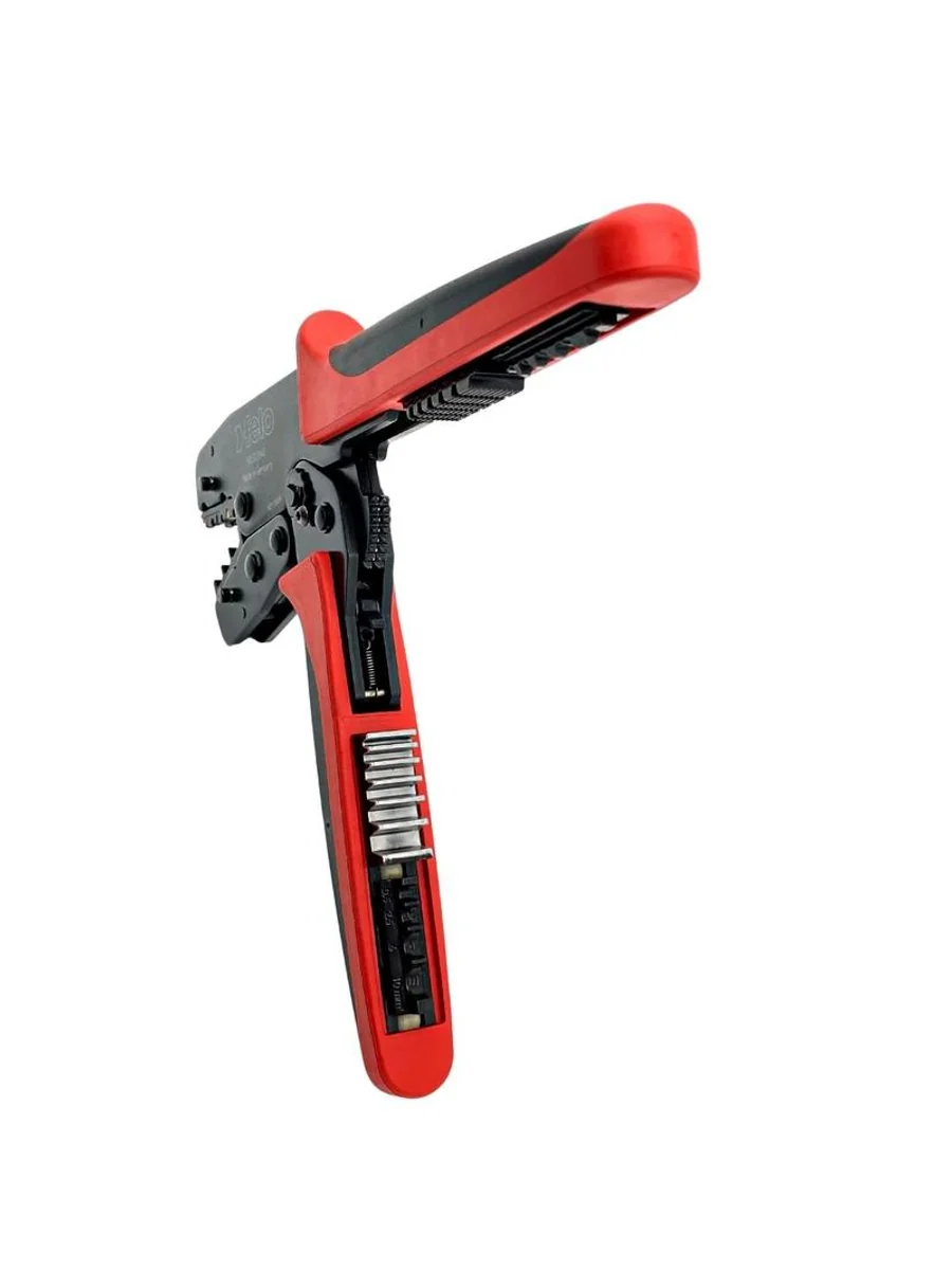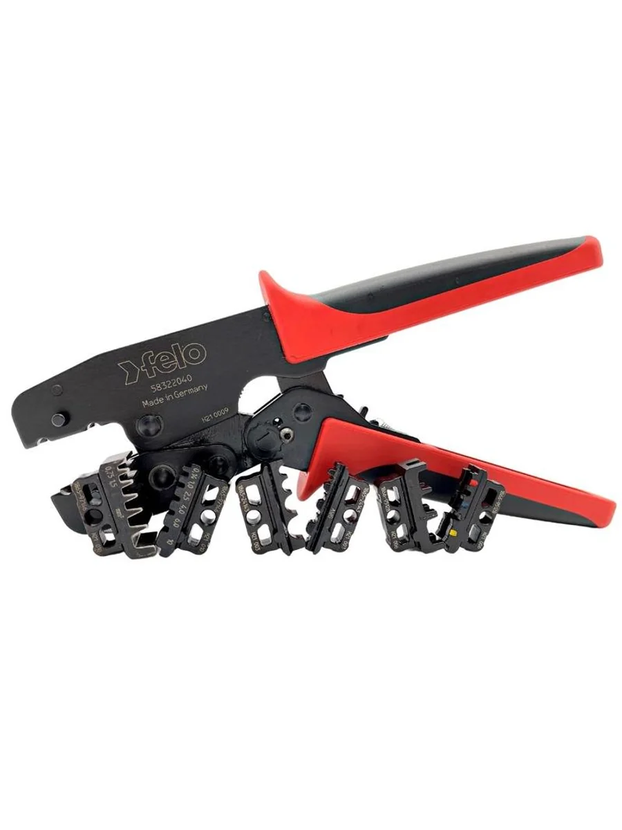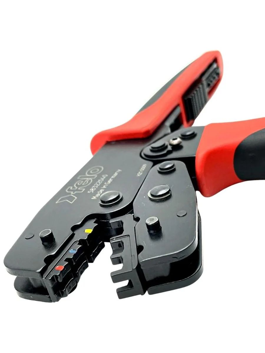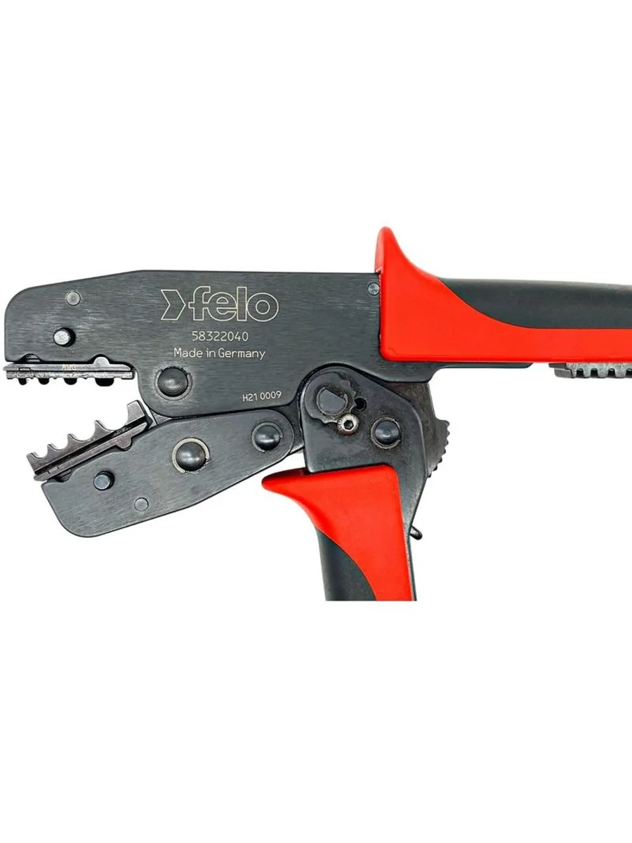 Пресс-клещи FELO 58322040 предназначены для опрессовки штекеров и кабельных, кольцевых наконечников. Инструмент имеет долгий срок службы, так как изготовлен из хромованадиевой инструментальной стали, закаленной в масле. Инструмент оснащен пружиной для быстрого раскрытия. Передаточная многорычажная система позволяет передавать на инструмент большое усилие при работе. Сменные насадки в комплекте пресс-клещей позволяют работать им методом овального обжима в диапазоне от 0,75 до 10 кв.мм. 1 Матрица: для обработки кабельных наконечников DIN с красной/синей/желтой изоляцией, штыревые кабельные наконечники, плоские вилки, плоские розетки, круглые штекеры, круглые розетки, стыковые и параллельные разъемы Профиль 1: красный 0,5-1,0 кв.мм Профиль 2: синий 1,5-2,5 кв.мм Профиль 3: 4,0-6,0 кв.мм 2 Матрица: для обработки наконечников проводов без изолирующей манжеты согласно DIN 46228, диапазон сечений 0,14 - 10,0 кв.мм 3 Матрица: для обработки неизолированных кабельных наконечников, поперечное сечение 0,1 - 10,0 кв.мм