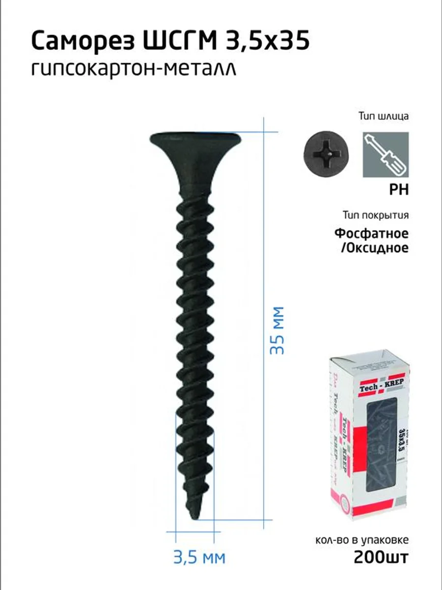 Саморез гипсокартон-металл 3.5х35 (коробка) (уп.200шт) Tech- | KeepBuilding