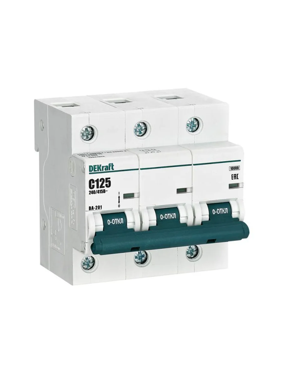 Автоматический выключатель серии ВА-201 Dekraft; 3P; номинальный ток 125 А; характеристика C; отключающая способность 10 кА; ширина модуля 27мм. Монолитная лицевая панель обеспечивает безопасную эксплуатацию аппарата. Окошко-индикатор всегда показывает состояние аппарата вне зависимости от положения рукоятки управления. Двухпозиционная защелка облегчает монтаж выключателя.