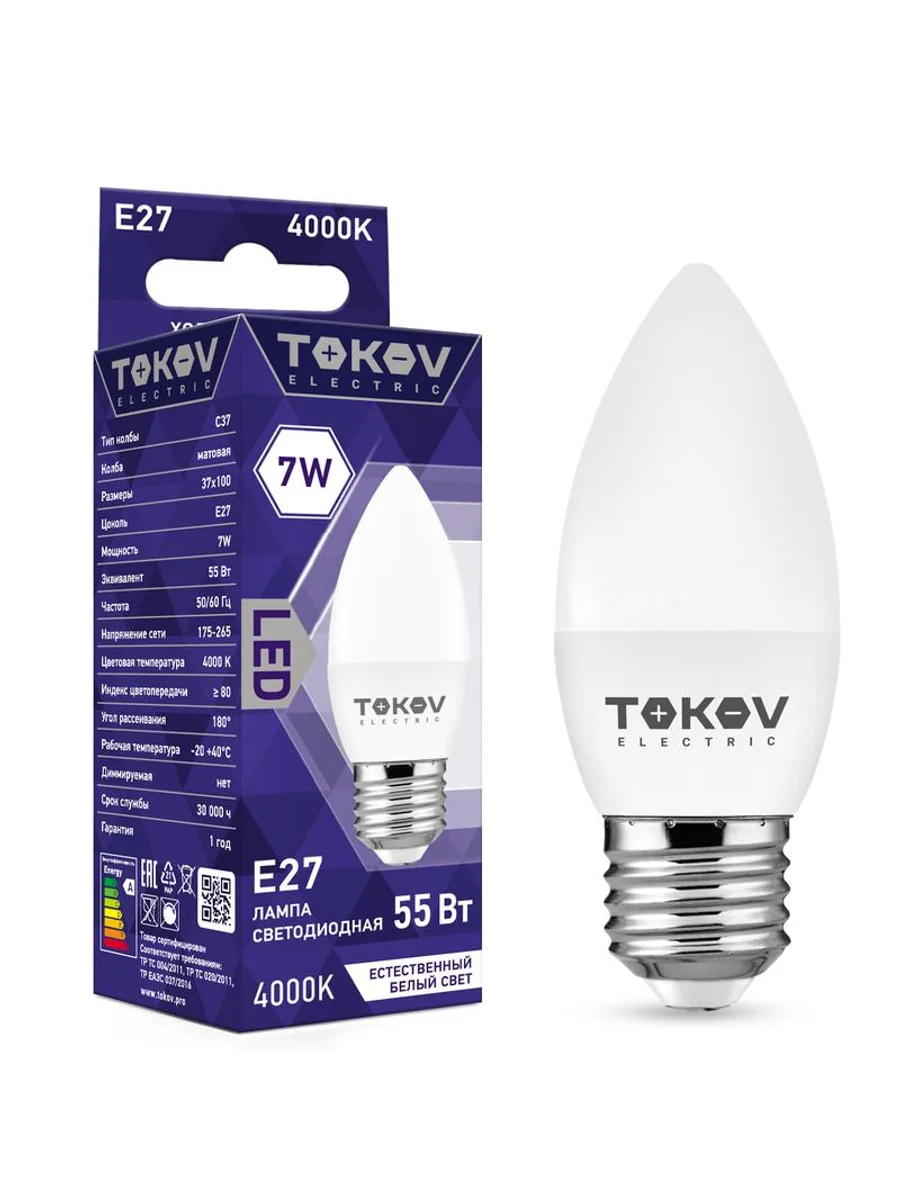 Лампа светодиодная 7Вт С37 4000К Е27 176-264В TOKOV ELECTRIC TKE-C37-E27-7-4K - купить в KeepBuilding | KeepBuilding