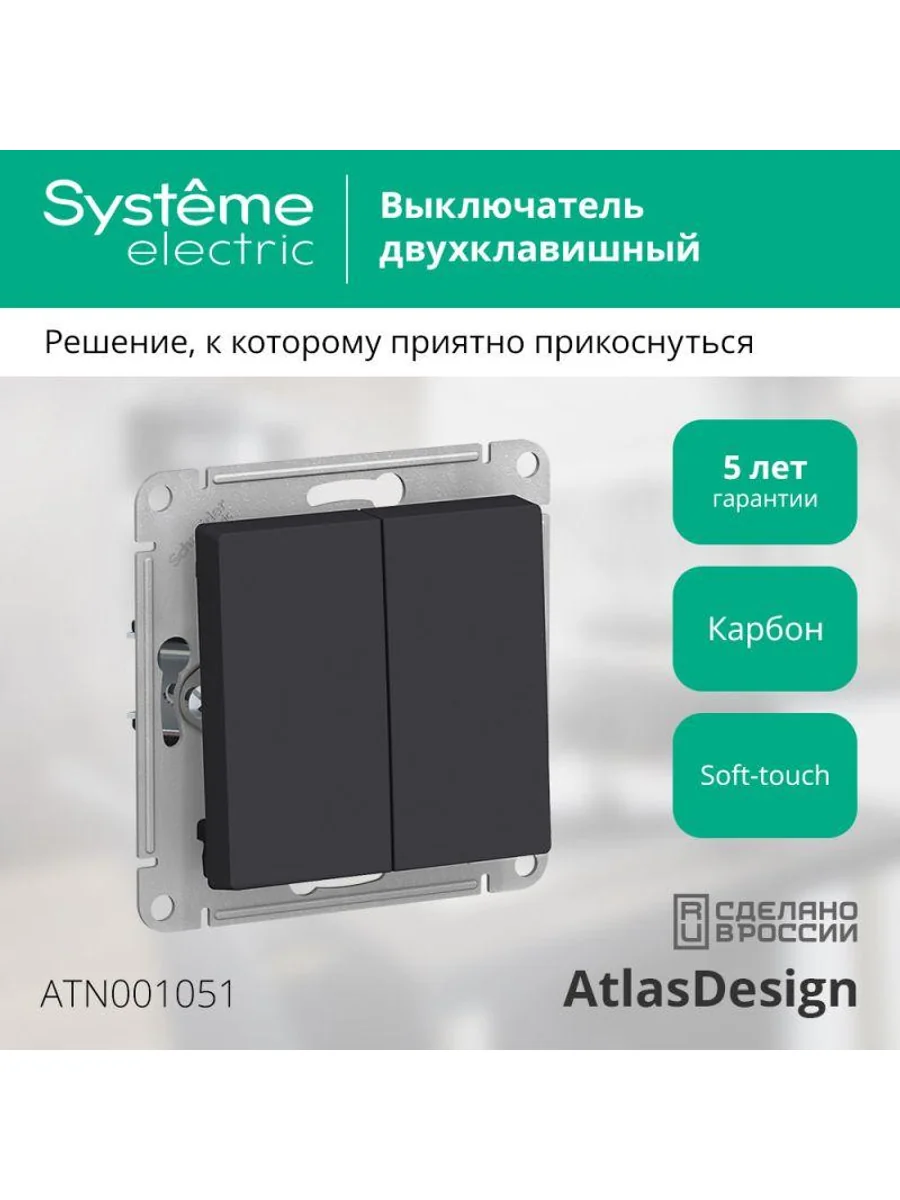 Механизм выключателя 2-клавишного Systeme Electric (ранее Schneider Electric) серии AtlasDesign в цвете карбон подходит для сетей 250 В, на ток 10 А. Двухклавишный выключатель позволяет управлять двумя источниками света с одной точки. Лицевые детали из качественного ABS-пластика, устойчивого к царапинам и УФ-излучению. Благодаря покрытию «soft touch» к изделию приятно прикасаться.