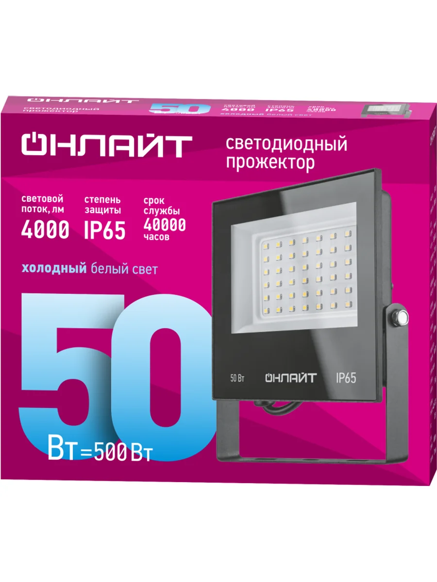 Прожектор 71 660 OFL-50-6K-BL-IP65-LED LED 50Вт IP65 6000К ОНЛАЙТ 19200 является аналогом галогенного прожектора мощностью 500 Вт. Корпус и рефлектор изготовлены из алюминиевого сплава. Рекомендуется к применению как средство наружного освещения (дворов и придомовых территорий, билбордов, стендов), так и внутреннего освещения, в помещении, для освещения витрин, залов, галерей, складов, гаражей.