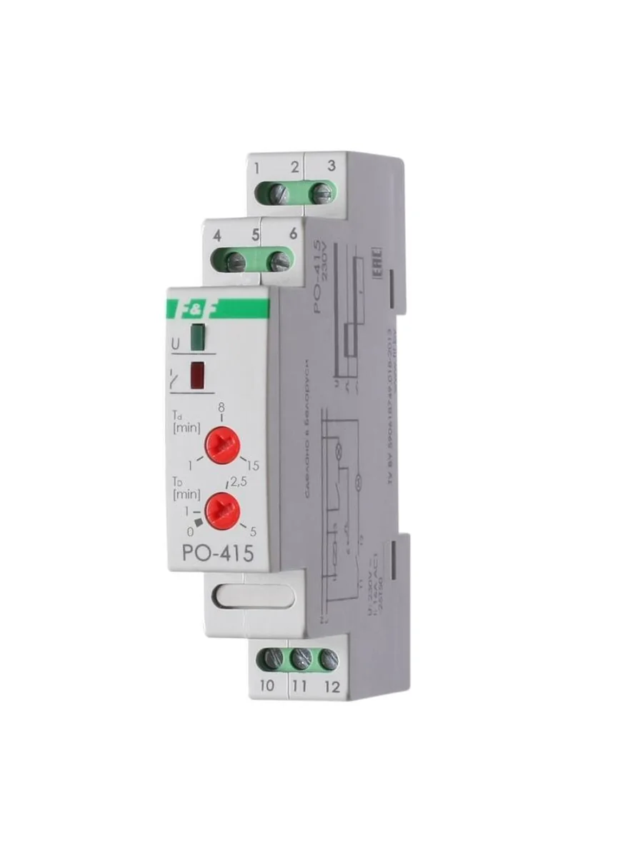 Реле времени серии "PO" Монтаж на DIN-рейку. Предназначено для поддержания работы устройства после размыкания управляющего контакта в течение установленного отрезка времени, при условии, что длительность управляющего сигнала больше задержки включения. Например, в вентиляционных системах, санузлах и т.п., выключателем включаем освещение вентилятор включится с задержкой, после выключения освещения вентилятор выключится через установленный отрезок времени. Принцип работы В результате замыкания управляющего контакта S, на время, превышающее t , контакты реле 11,12 замыкаются. Размыкание управляющего контакта S вызывает отсчет установленного времени, по истечении которого работа реле прекращается. Особенности: вход управления; напряжение питания 230 В AC; задержка включения 0/1...5 мин ; задержка отключения 1...15 мин ; контакт - 1NO/NC (16 А).