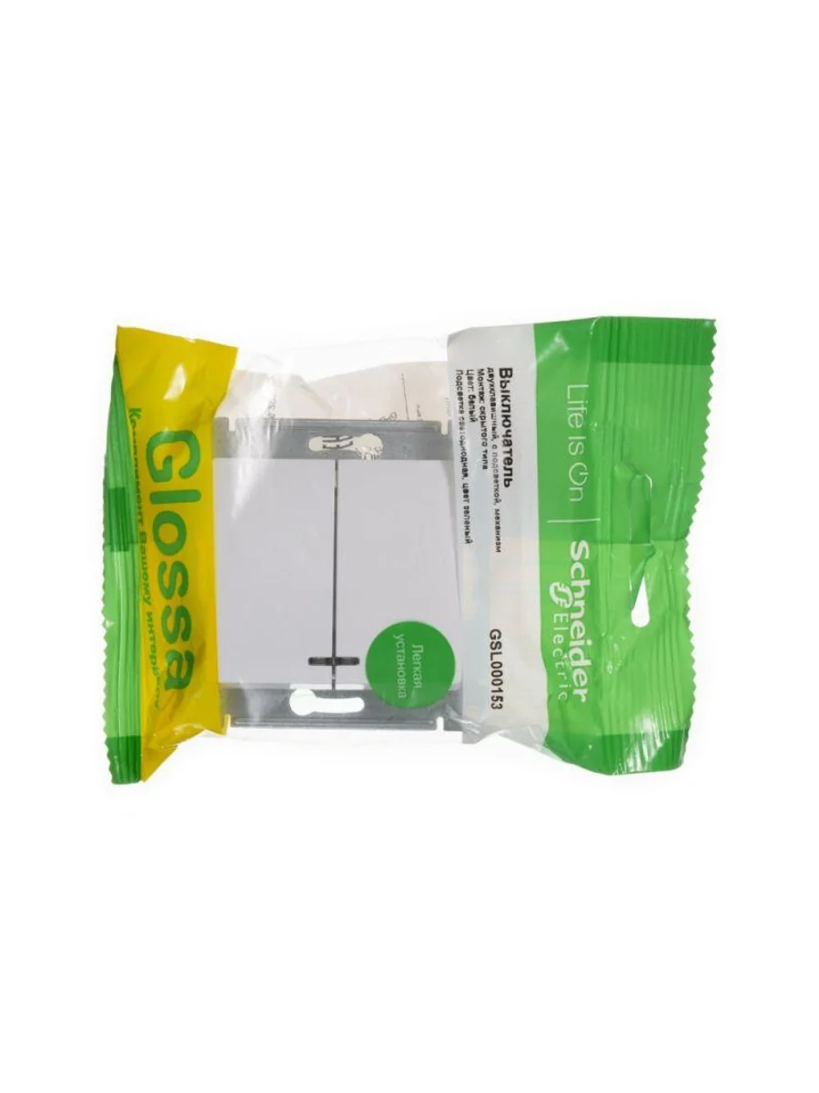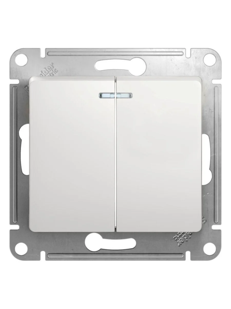 Механизм Systeme Electric серии Glossa (цвет белый) выключателя 2-клавишного c подсветкой подходит для сетей 250 В, на ток 10 А. - Благодаря современной светодиодной подсветке зеленого цвета изделие легко найти в темноте. - Двухклавишный выключатель позволяет управлять двумя источниками света с одной точки. - Выполнен из материала PС+ASA, стойкого к УФ-излучению и появлению царапин. - Эргономичные клеммы расположены в два ряда: сверху и снизу (ранее Schneider Electric NU521118N).