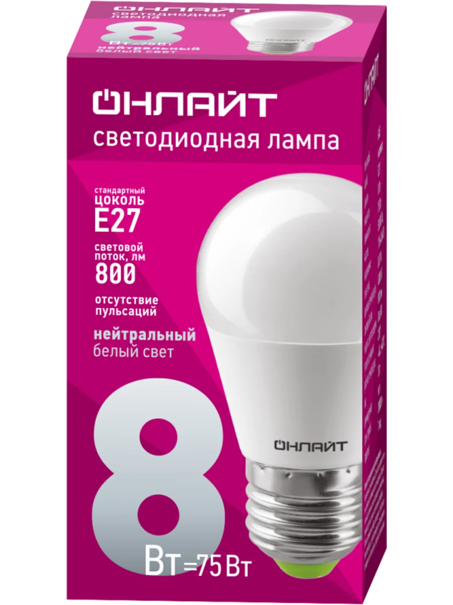 Лампа светодиодная 71 627 OLL-G45-8-230-4K-E27 8Вт шар 4000К нейтр. бел. E27 600лм 230-264В ОНЛАЙТ 71627 - купить в KeepBuilding | KeepBuilding